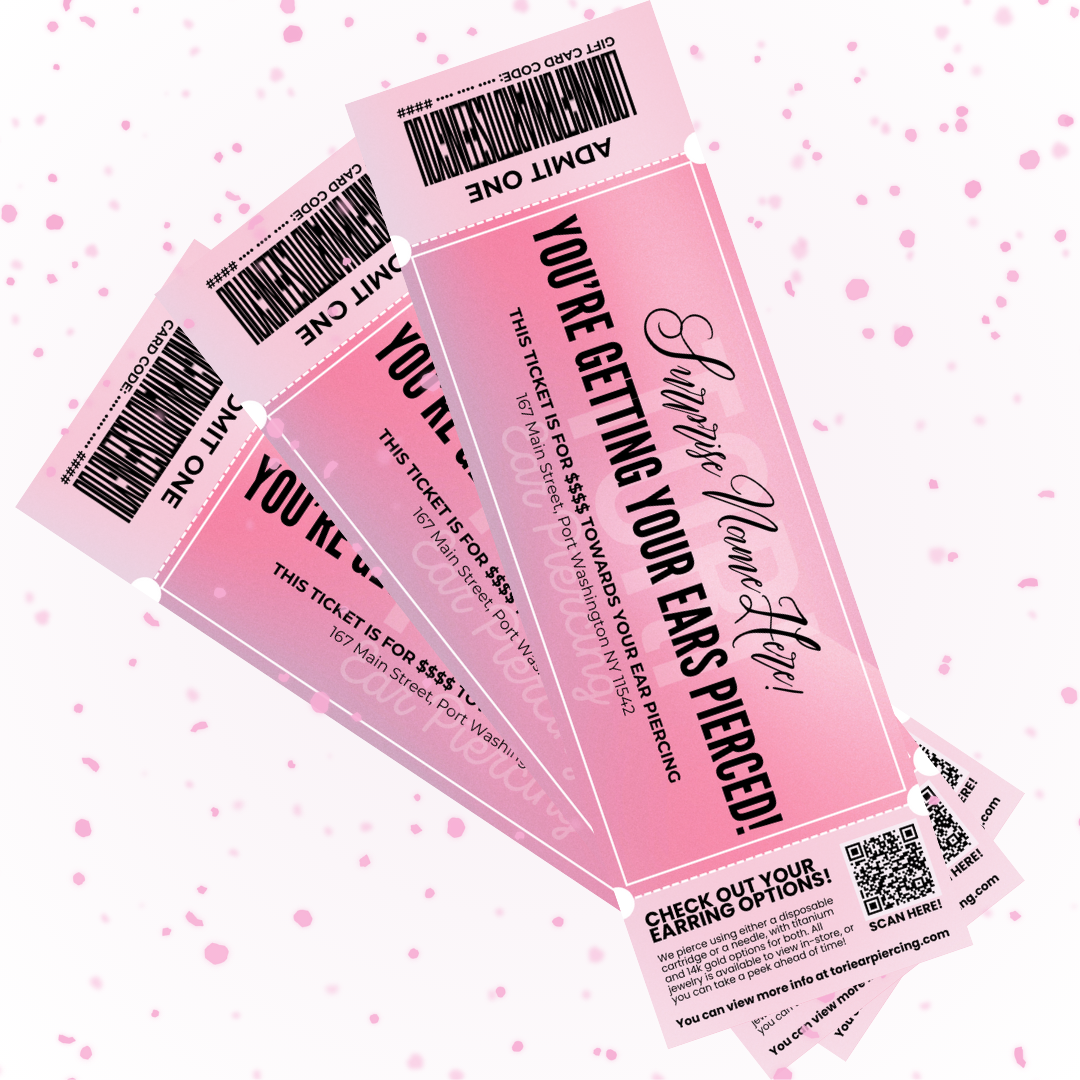 Our Piercing Tickets are customizable printable tickets to give to someone your looking to gift a piercing! We can customize them with their name any other addition info such as if this is in addition to a gift card or bundle or a appointment date. See the bottom of the page for more info!
