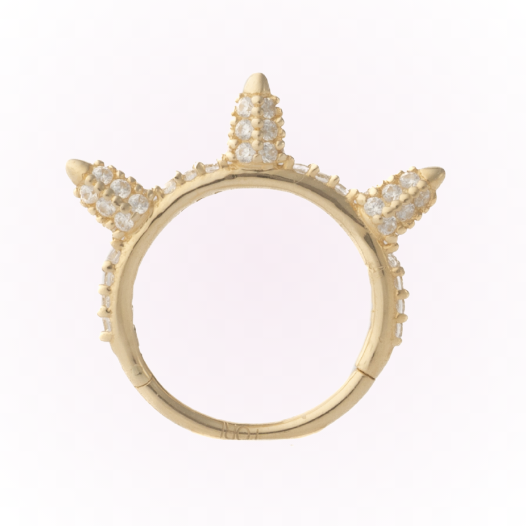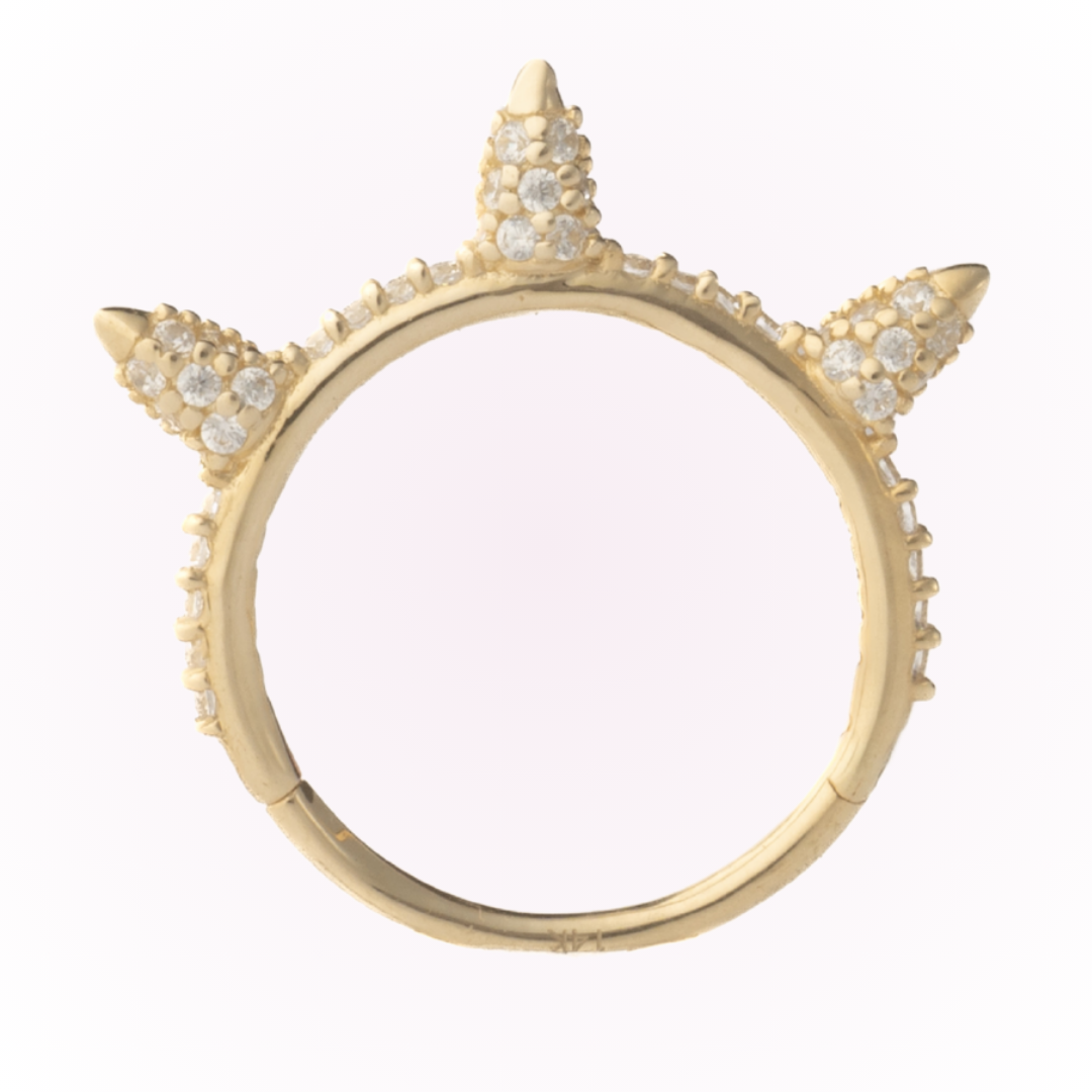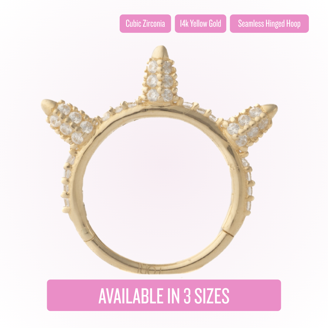 Eleva tu estilo con el aro "Empress". Elaborado en oro macizo de 14k, este aro articulado sin costuras presenta un impresionante diseño de tres puntas adornado con brillantes circonitas cúbicas engastadas en pavé para un look audaz y regio. Perfecto para añadir un toque de lujo a tu colección de piercings.
