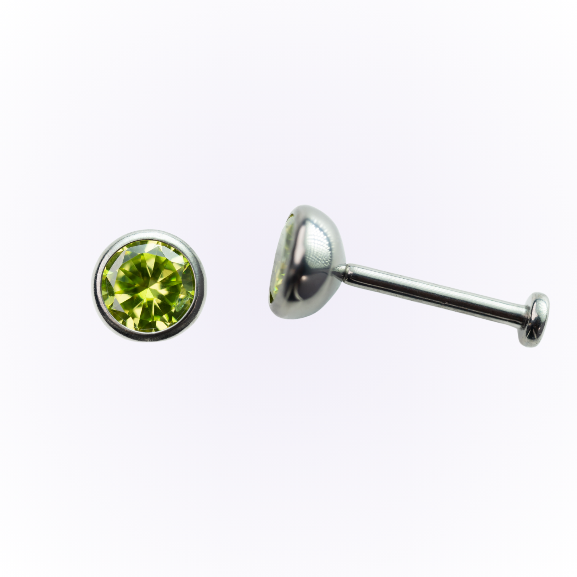 Broche de circonita cúbica verde manzana con engaste de bisel, sin rosca, de parte trasera plana.