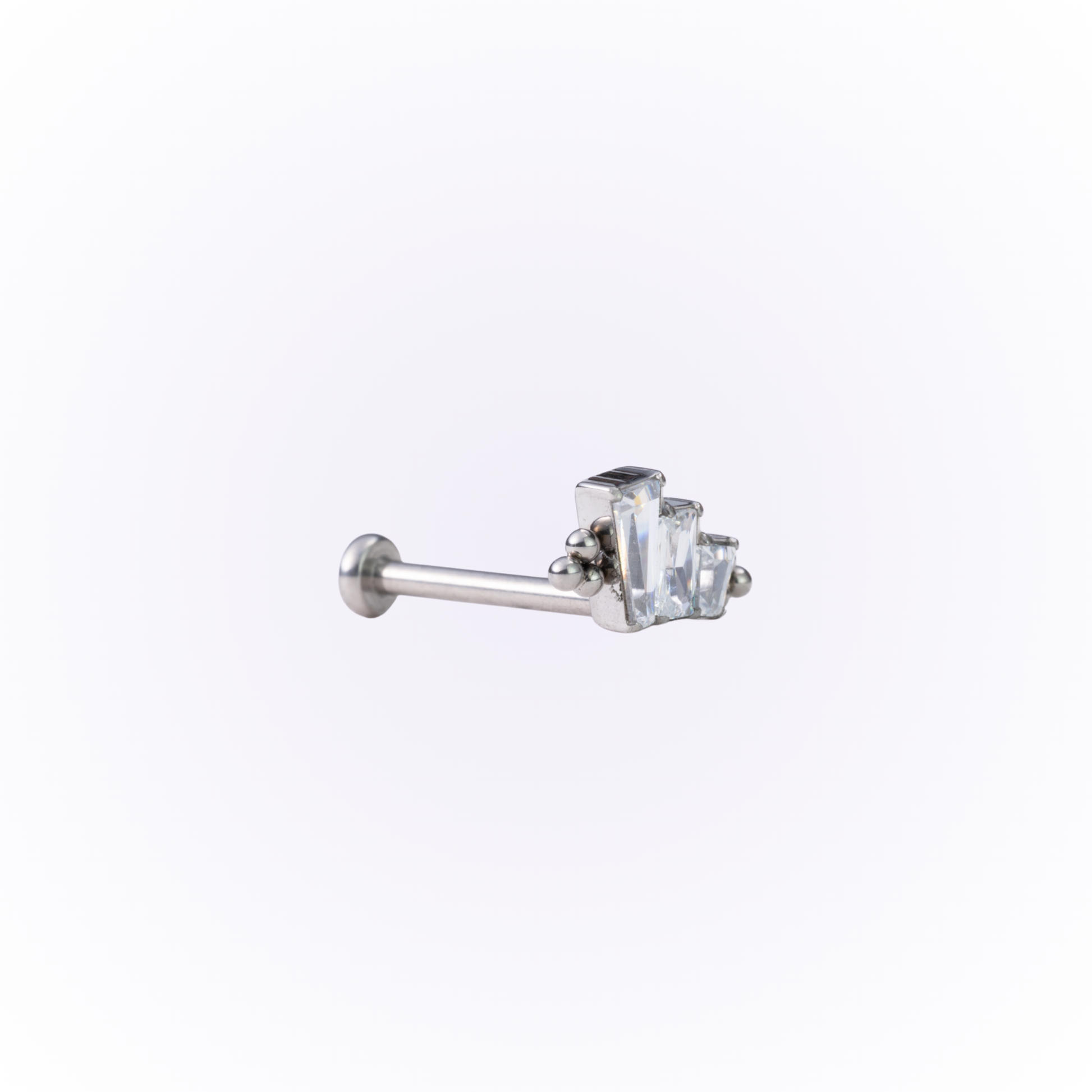 Adéntrate en la elegancia de la Era del Jazz con "Gatsby Glamour", que presenta tres baguettes de circonita cúbica en cascada, de mayor a menor, enmarcadas por tres bolas de titanio en cada extremo. Este diseño de inspiración Art Déco irradia una sofisticación atemporal, perfecta para añadir un toque vintage a cualquier piercing.