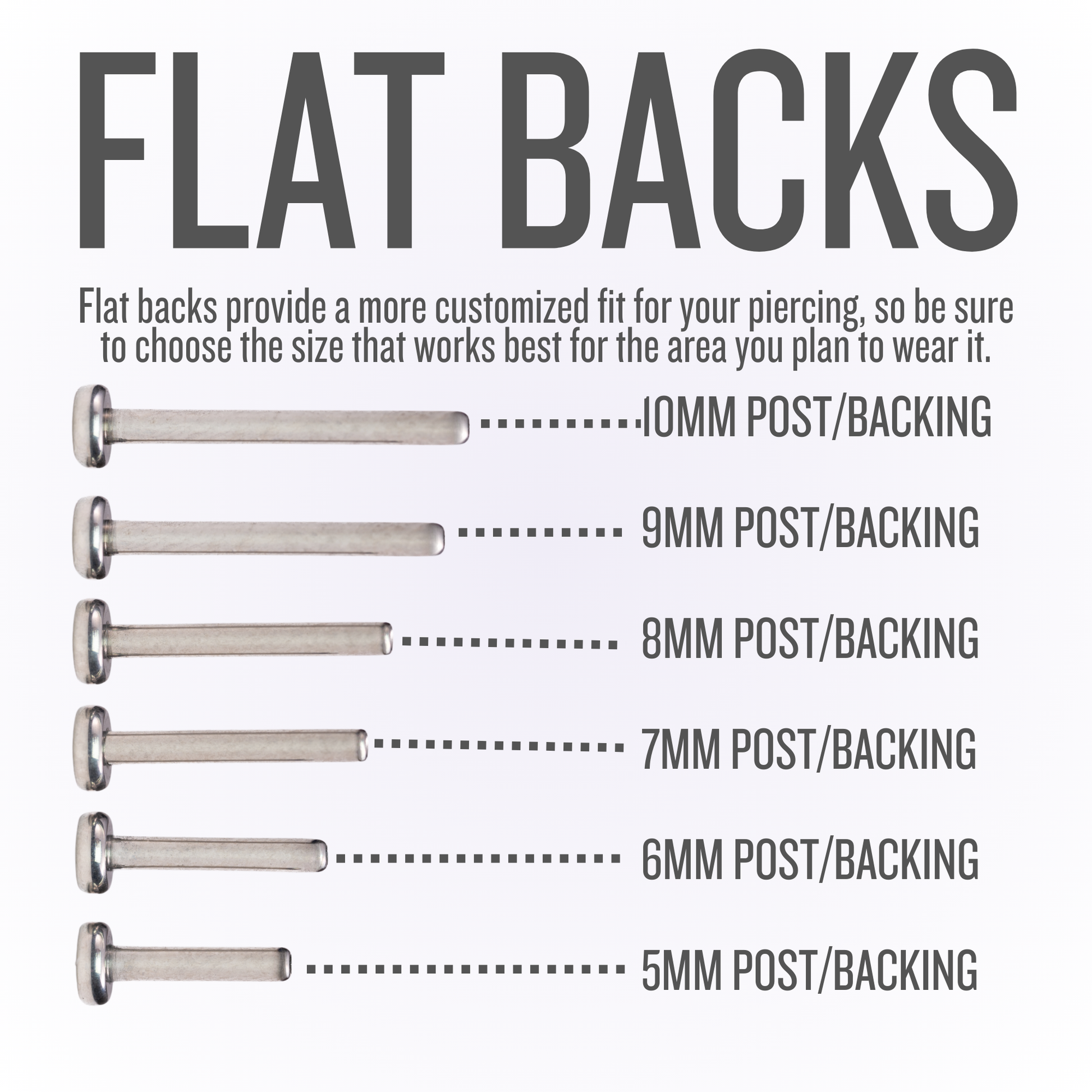 Tenga en cuenta que los pendientes Flatback se ajustan a medida a su oreja. Al comprarlos, asegúrese de seleccionar el tamaño adecuado para la perforación donde desea usar la joya. Si no está seguro de su tamaño, le recomendamos visitar nuestro estudio, donde podemos ayudarle a encontrar el ajuste correcto o medir el grosor de su oreja en la zona de la perforación. Además, si compra solo la cabeza, no se incluirá el poste; solo se proporciona la cabeza sin rosca.