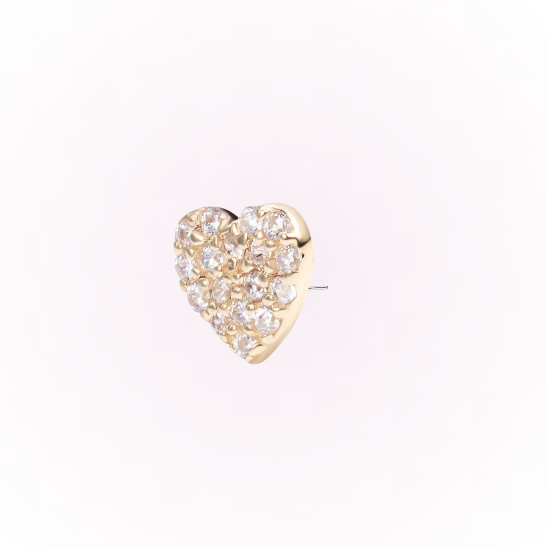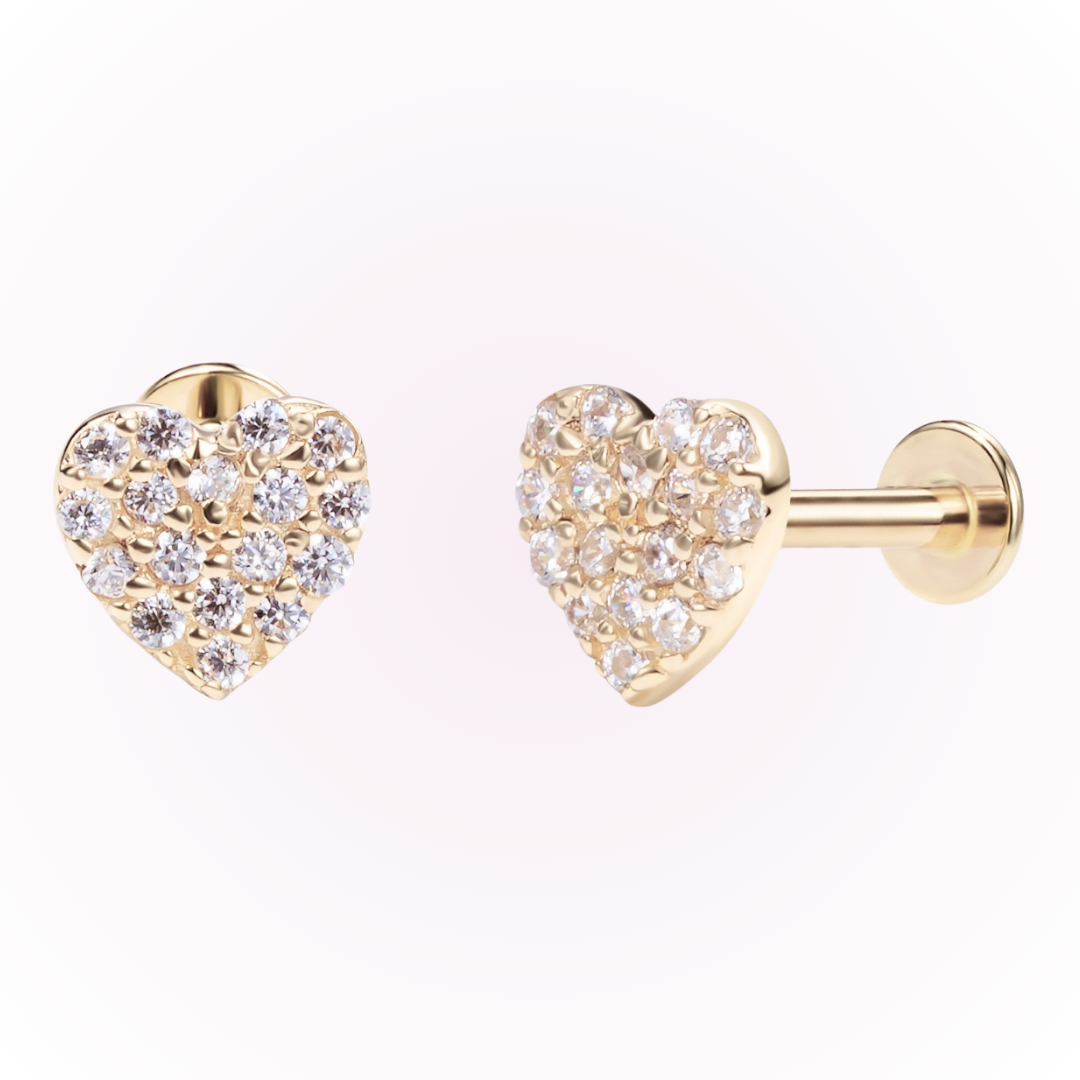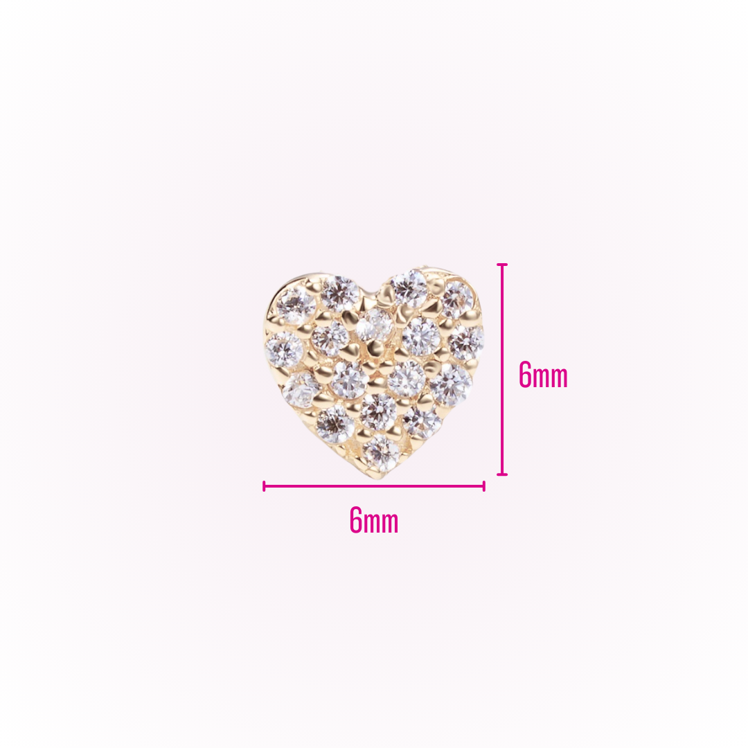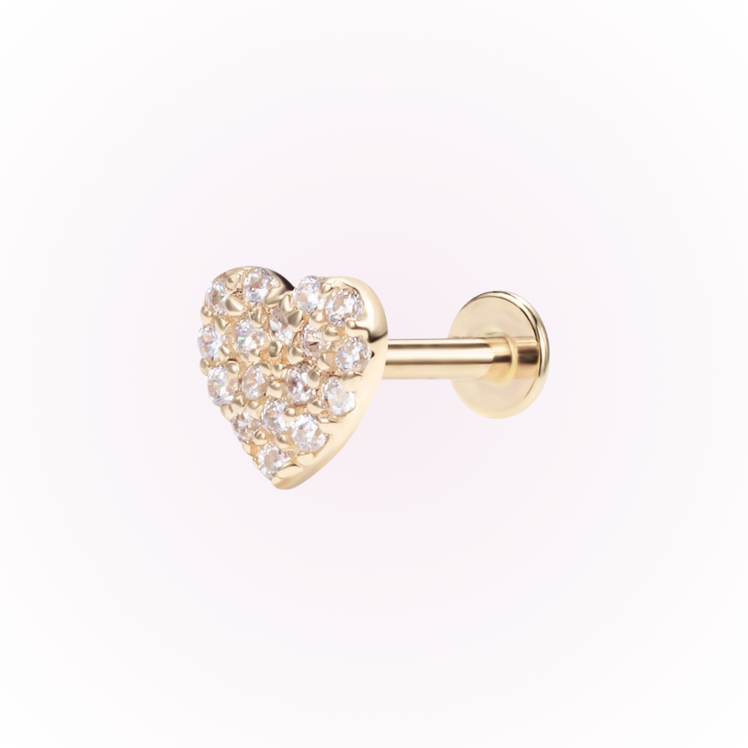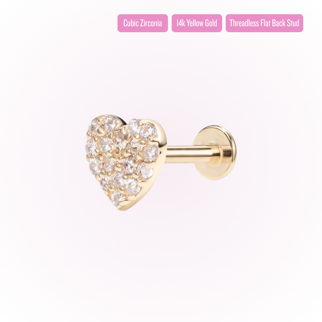 El pendiente «Love» luce un delicado diseño de corazón, engastado con brillantes circonitas cúbicas pavé, creando un look elegante y atemporal. Elaborado en oro amarillo macizo de 14k, este pendiente de botón plano sin rosca es perfecto para añadir un toque romántico a cualquier piercing.