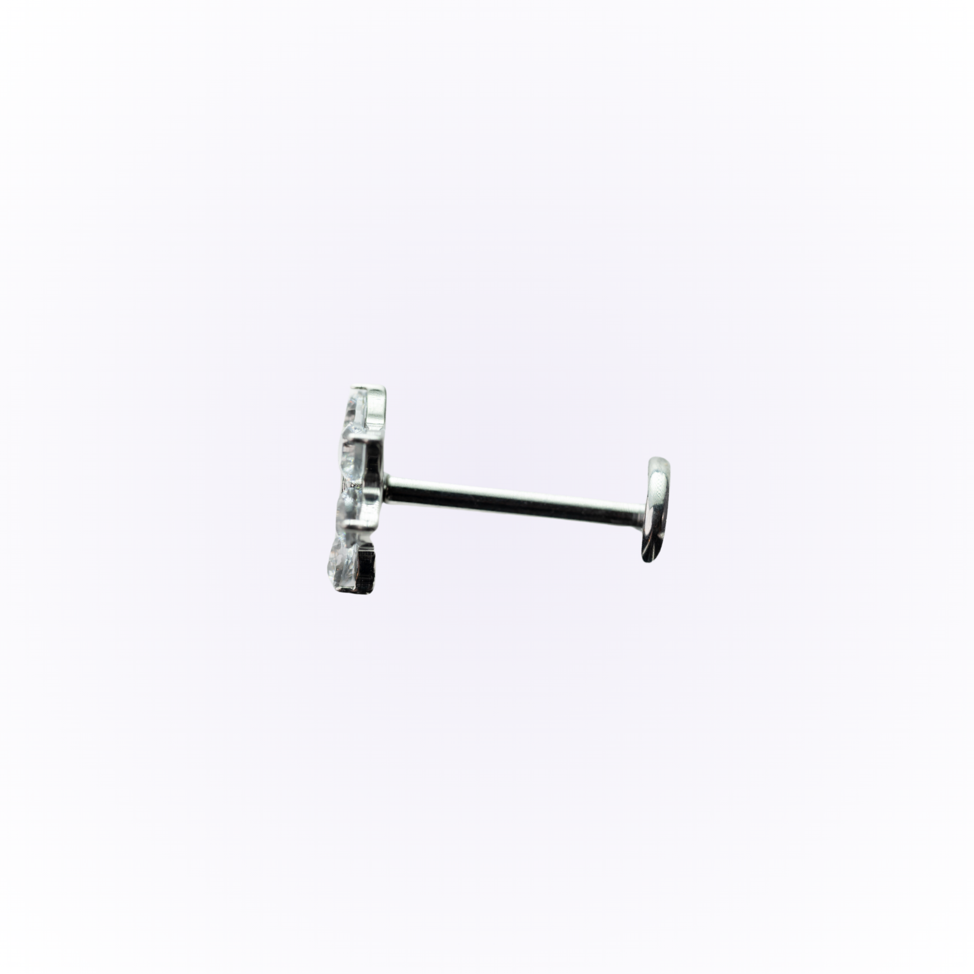 Demuestra tu amor por tus amigos peludos con "Loyalty", un diseño de huella de titanio adornado con cuatro piedras brillantes, disponibles en circonita cúbica transparente u ópalo. Elaborado en titanio resistente, este diseño emotivo añade un toque personal y significativo a cualquier piercing.