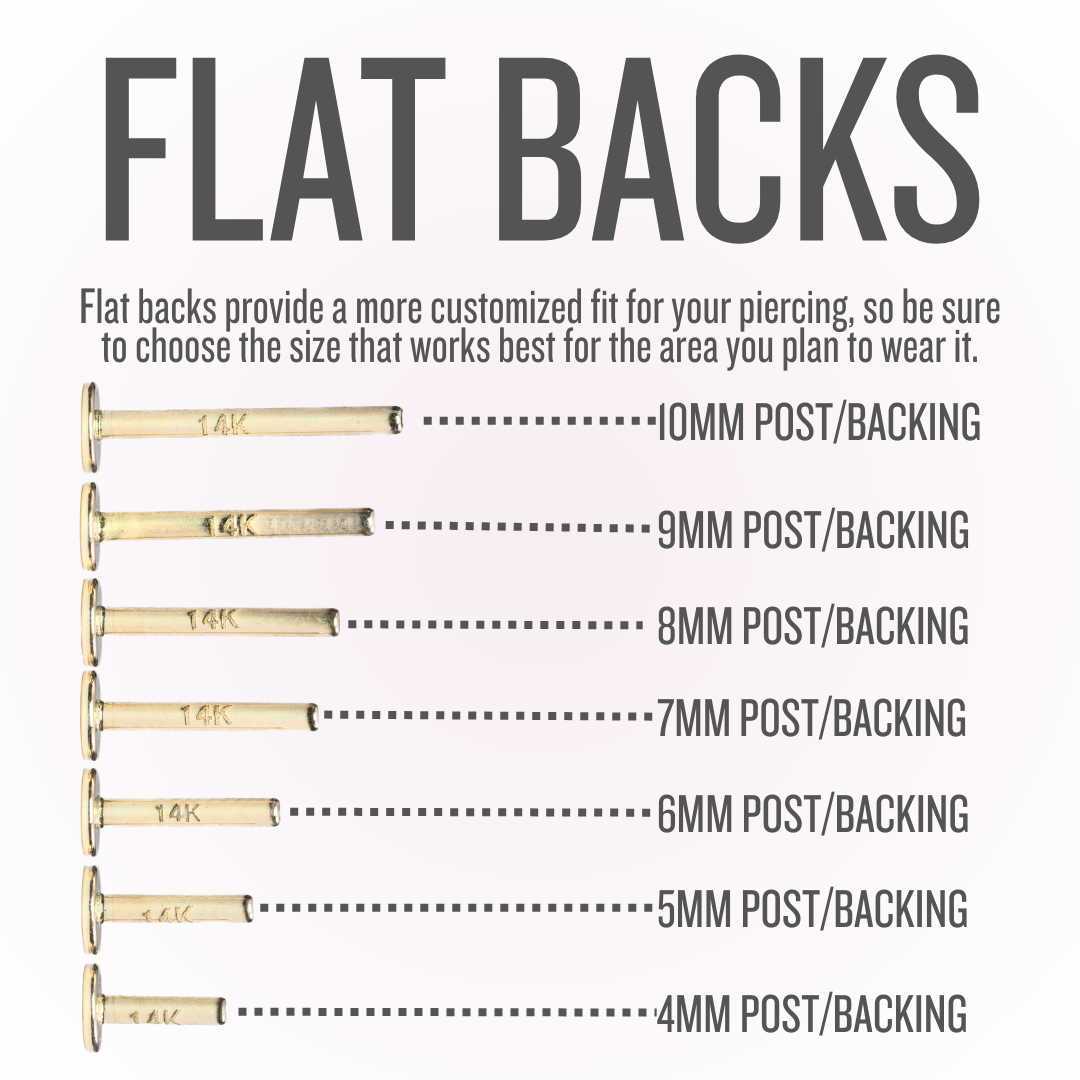 Ten en cuenta que los pendientes Flatback se ajustan a medida a tu oreja. Al comprarlos, asegúrate de seleccionar la talla adecuada para la perforación donde deseas usar la joya. Si no estás seguro de tu talla, te recomendamos visitar nuestro estudio, donde podemos ayudarte a encontrar la talla correcta o medir el grosor de tu oreja en la zona de la perforación.