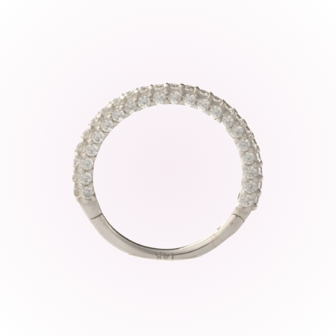 El pendiente de aro "Venus" irradia elegancia con su diseño impecable en oro de 14k, que luce tres hileras de deslumbrantes circonitas cúbicas engastadas en pavé para un look brillante y refinado. Perfecto para quienes buscan un pendiente sofisticado con un toque de glamour.