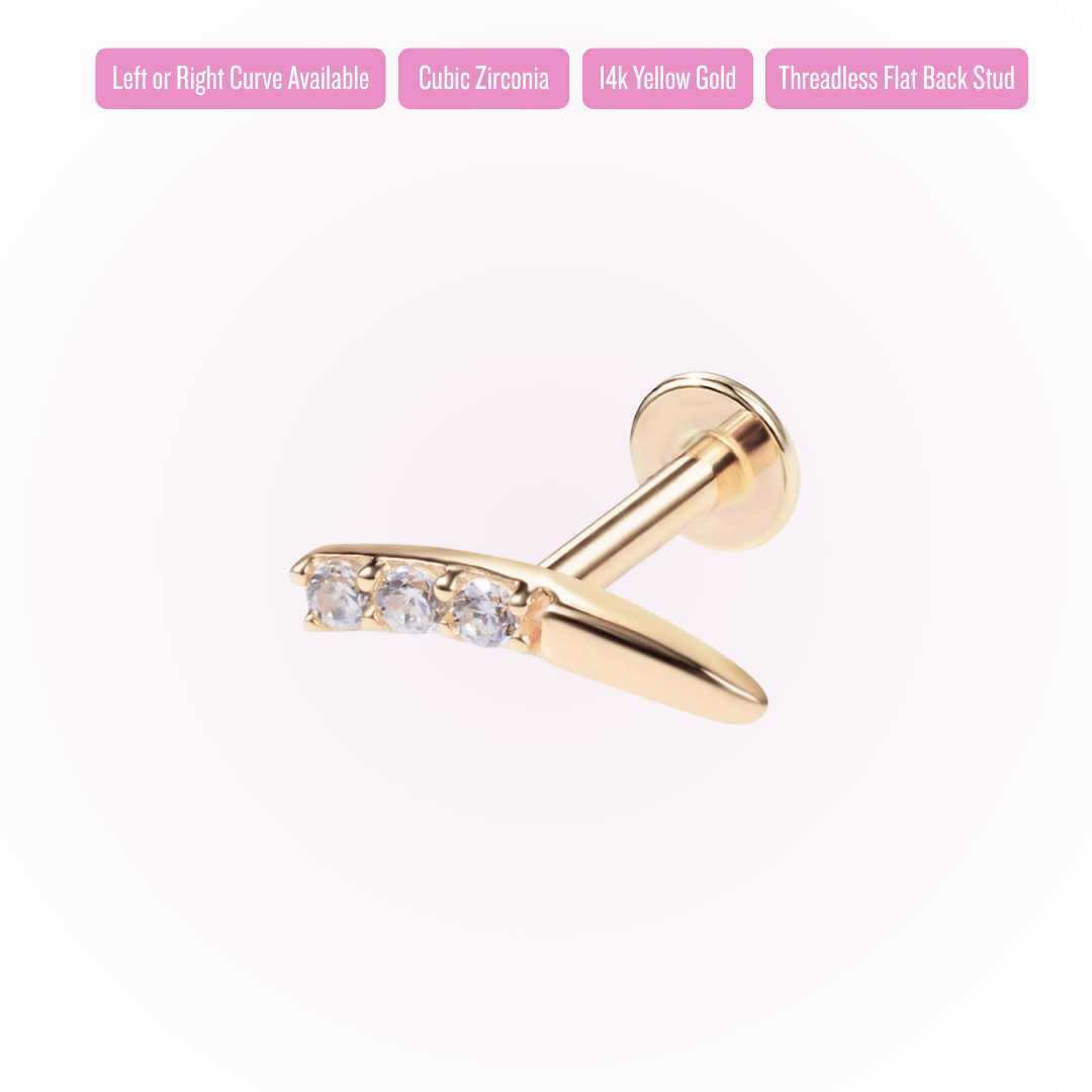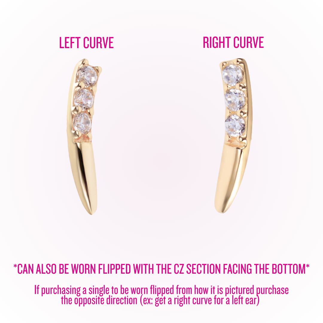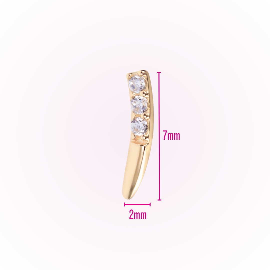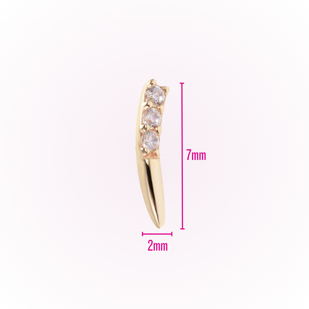 Saca a relucir tu lado más atrevido con "Wild", un llamativo pendiente de oro de 14k con forma de cuerno y barra curva, adornado con tres brillantes circonitas cúbicas. Disponible para la oreja izquierda o derecha, esta pieza única le da un toque moderno y elegante a tu piercing.