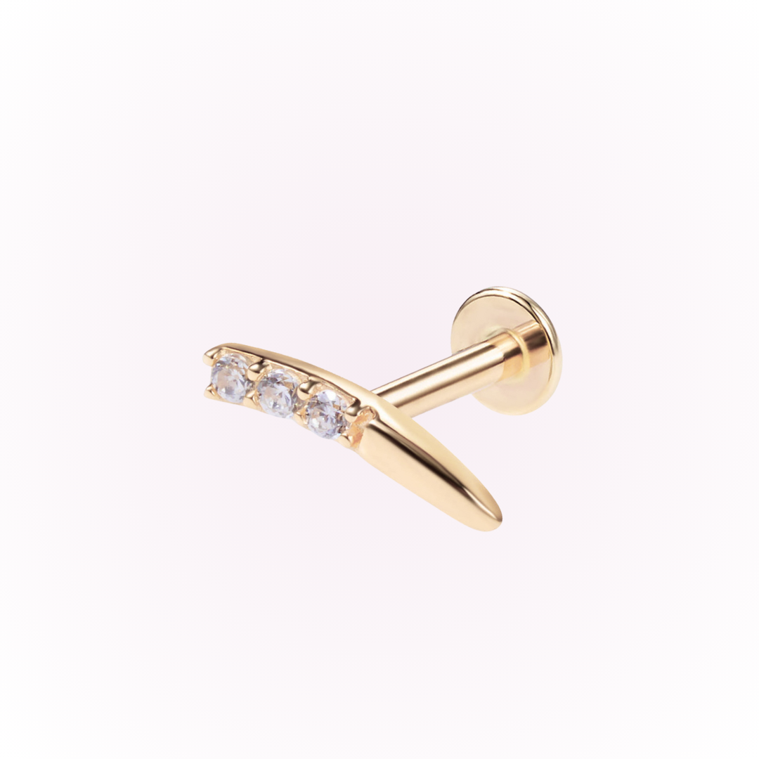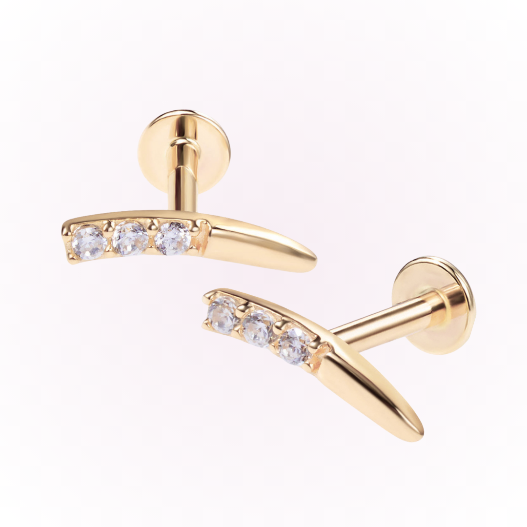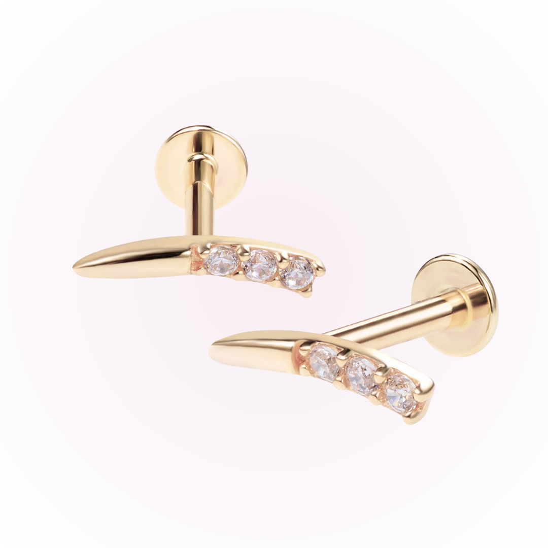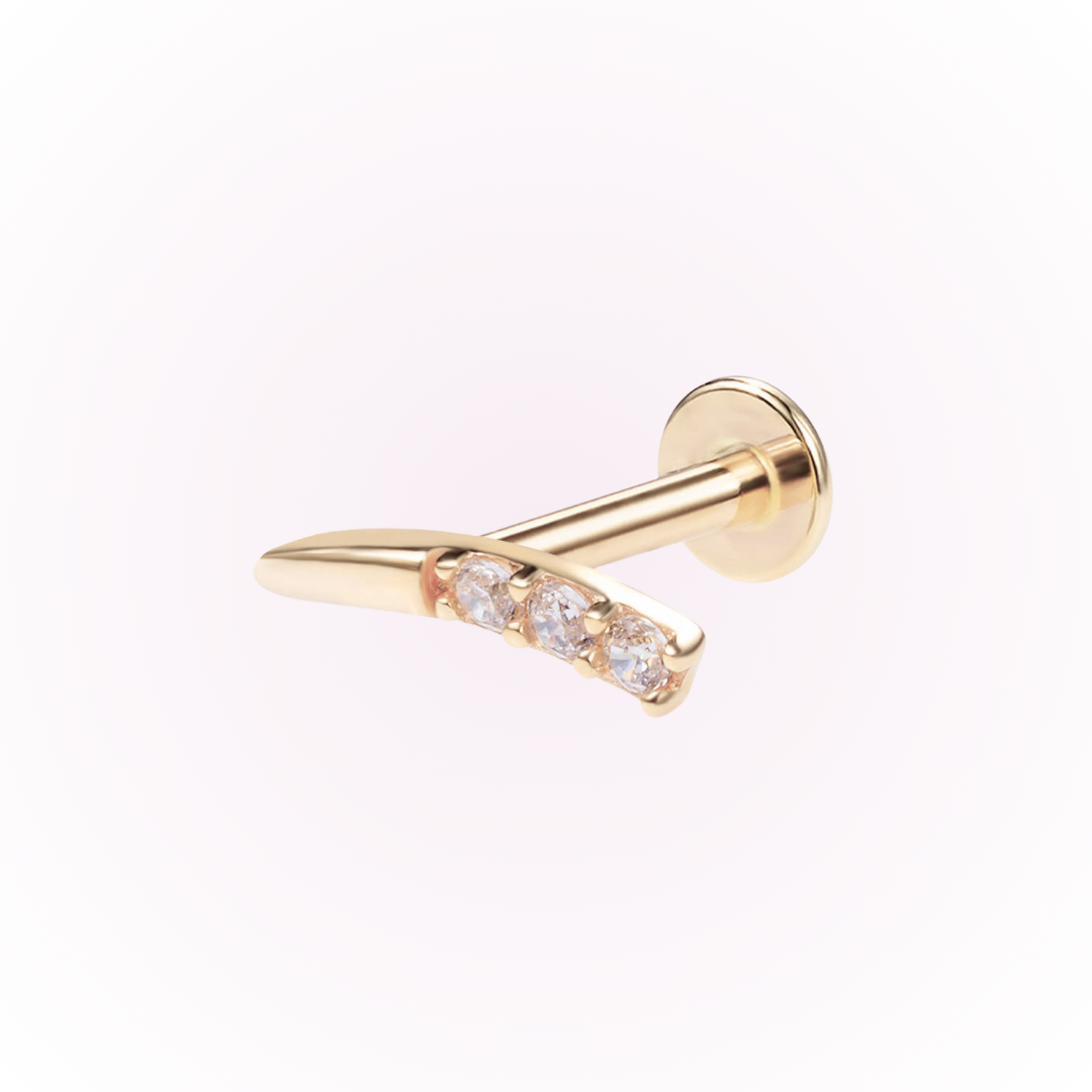 Saca a relucir tu lado más atrevido con "Wild", un llamativo pendiente de oro de 14k con forma de cuerno y barra curva, adornado con tres brillantes circonitas cúbicas. Disponible para la oreja izquierda o derecha, esta pieza única le da un toque moderno y elegante a tu piercing.