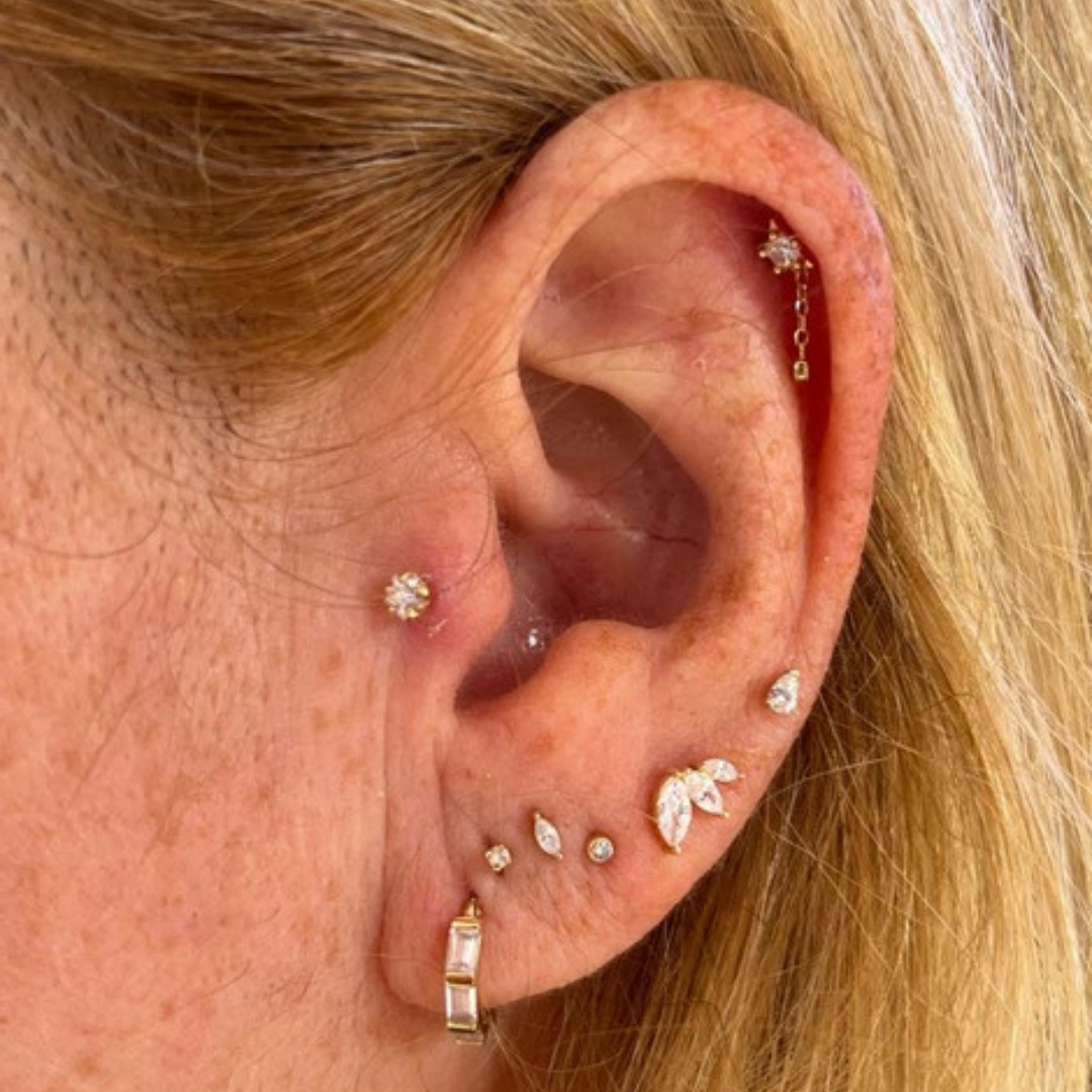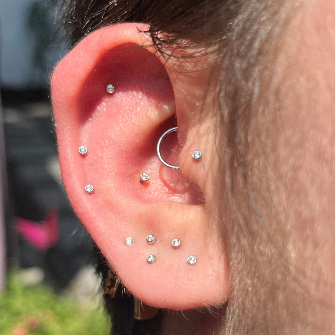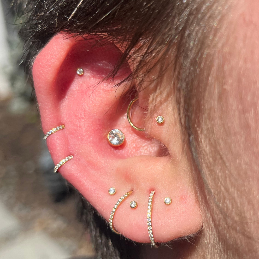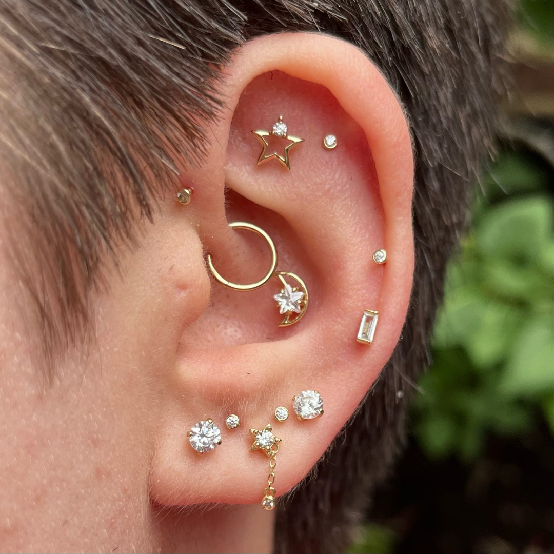 Check out some of our curated ear styling examples below! These photos feature both our team members and amazing customers who let us design their ear setups. Most of the earrings shown are available for purchase right here at our studio!
