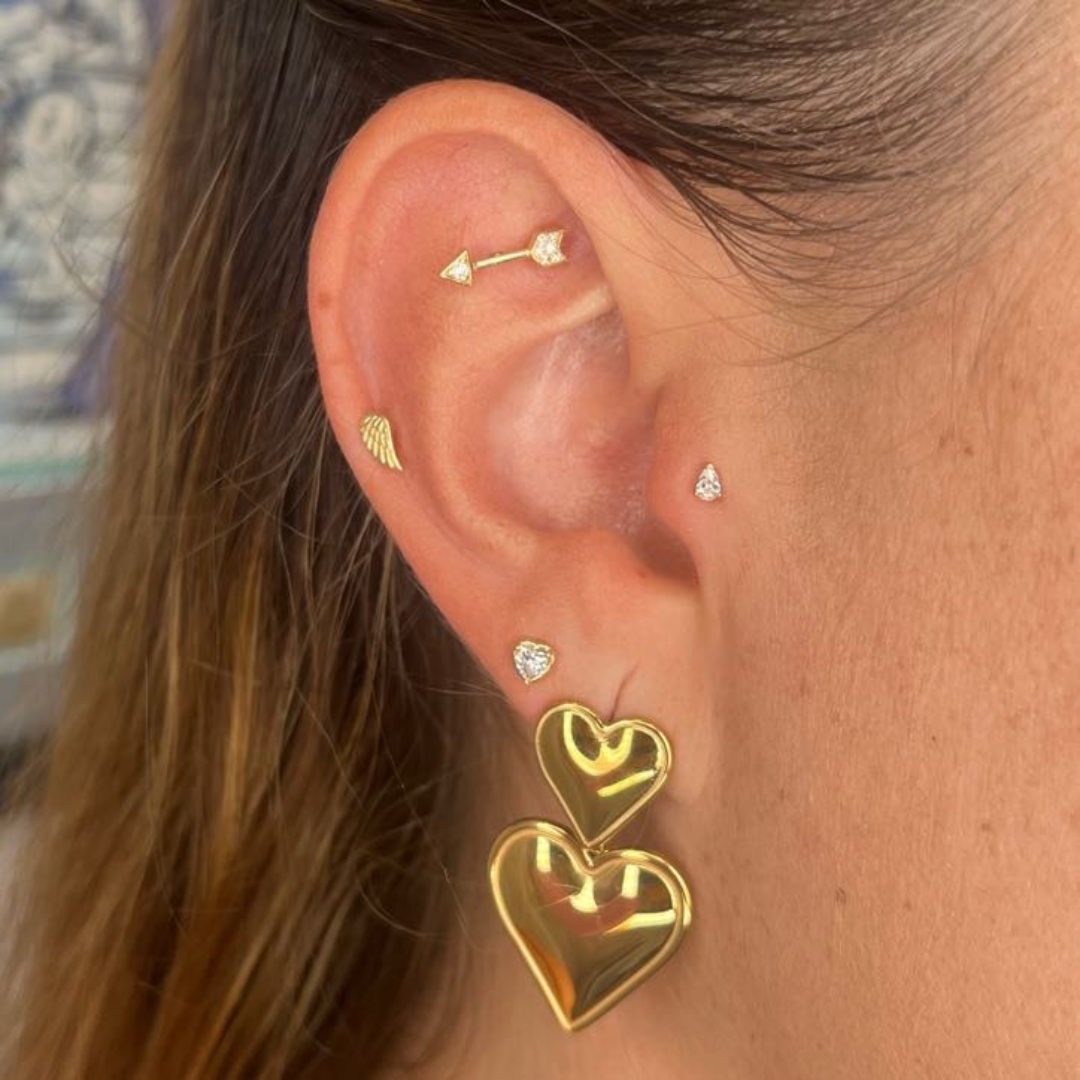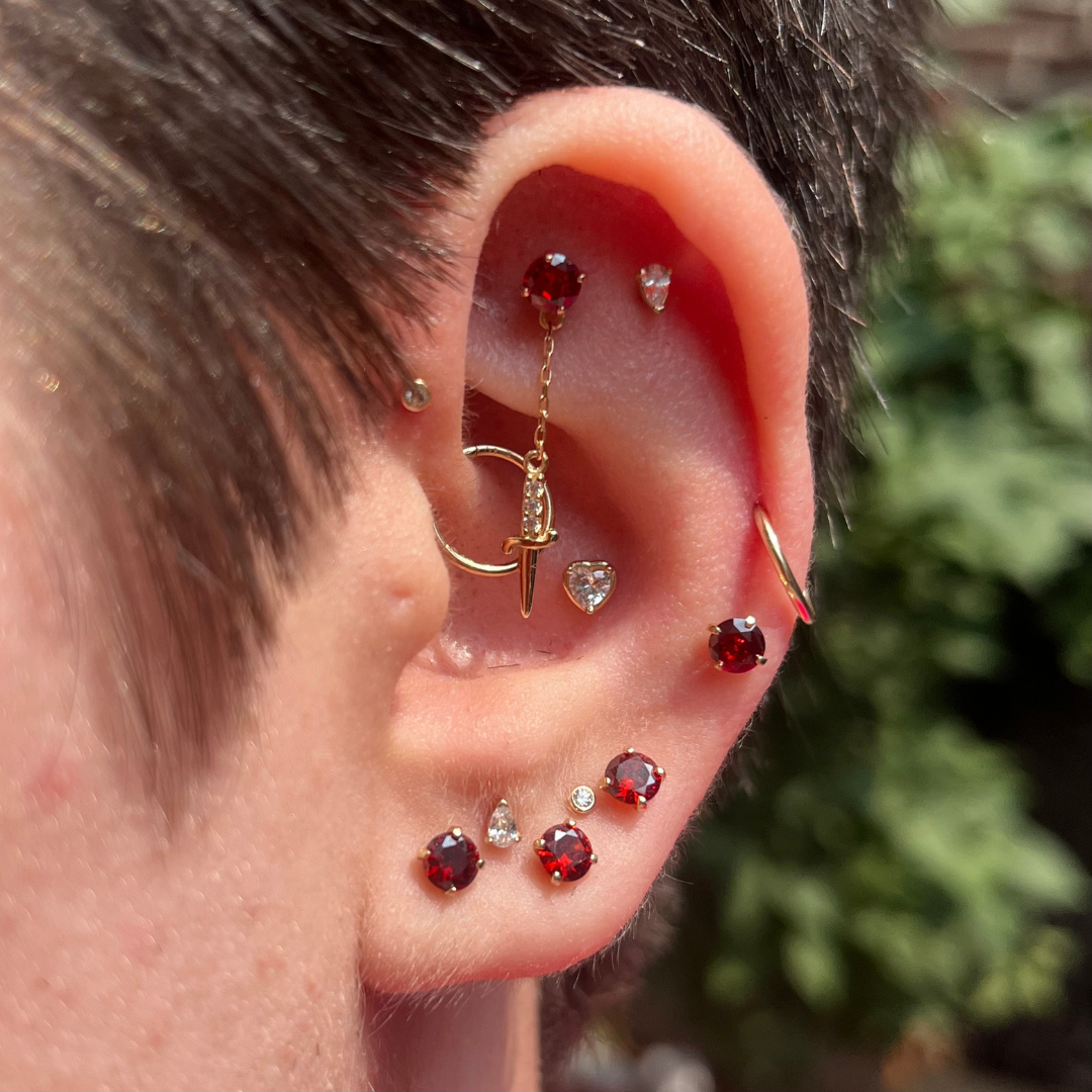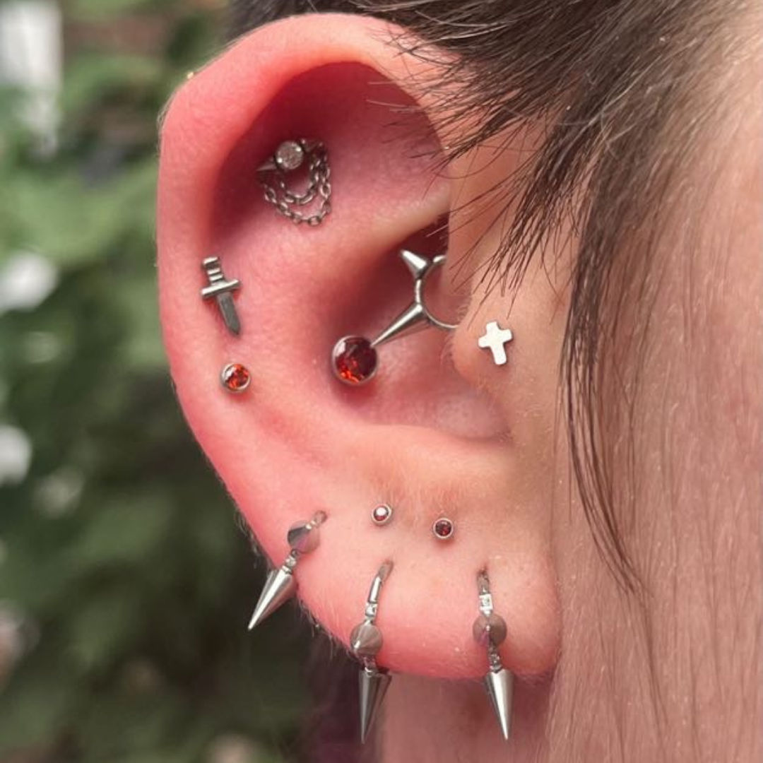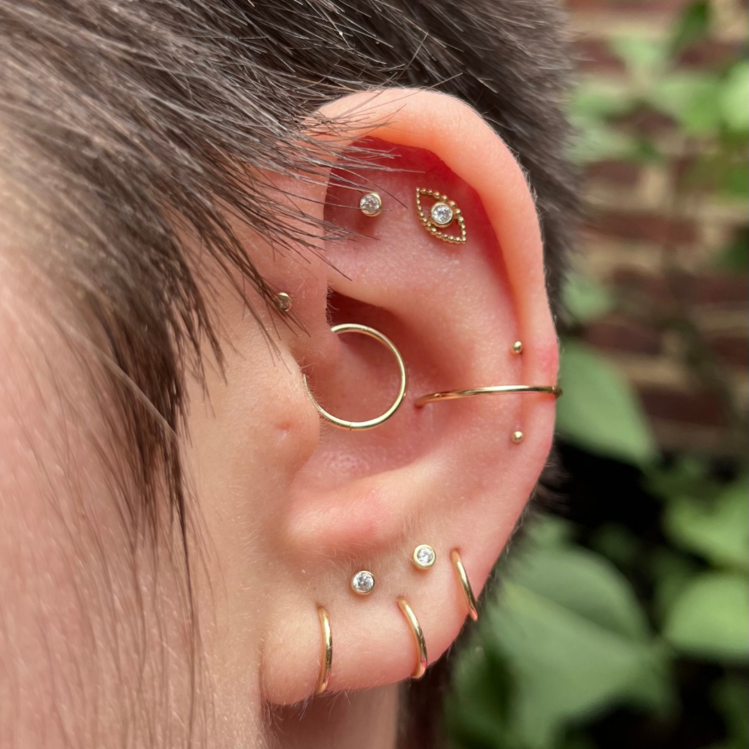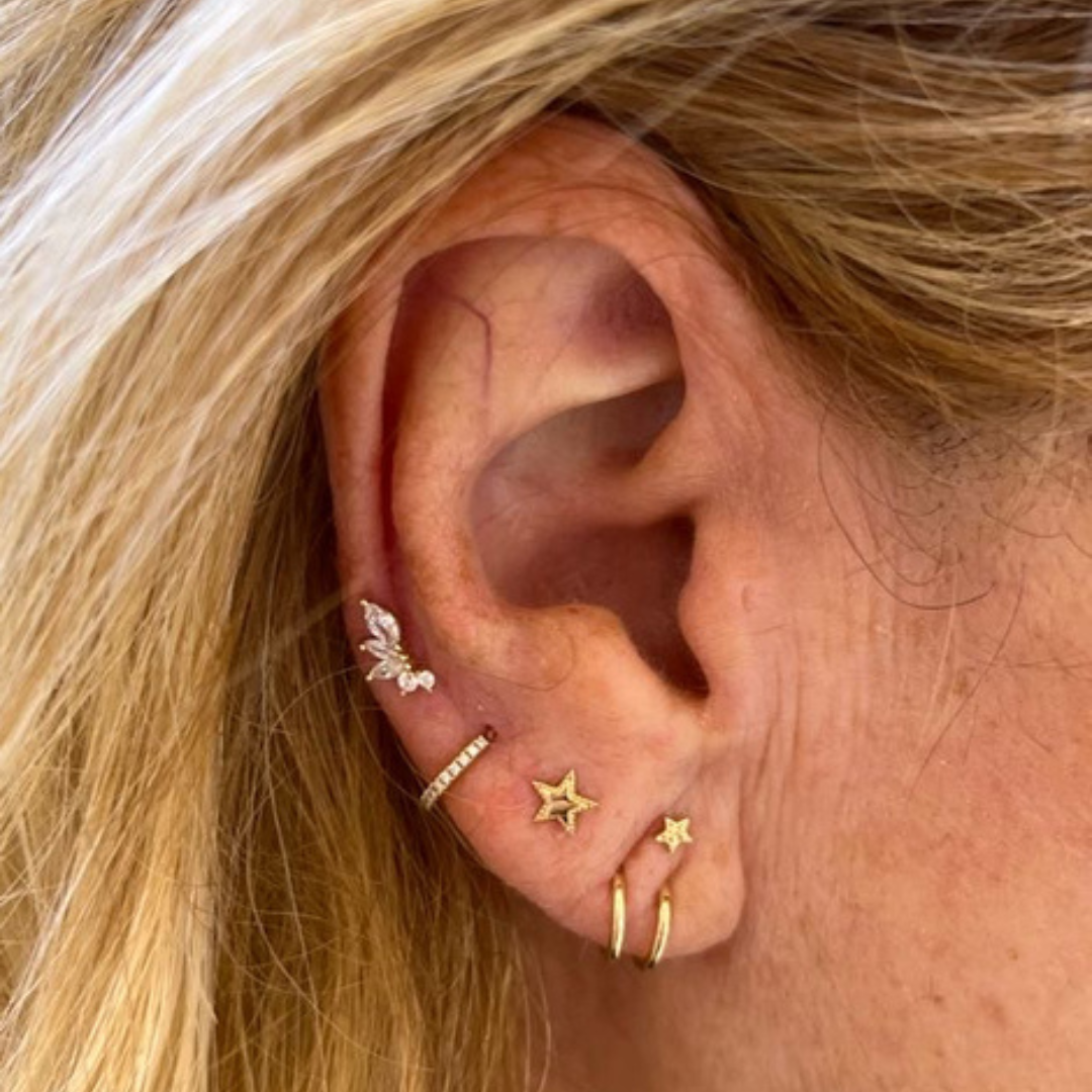 Check out some of our curated ear styling examples below! These photos feature both our team members and amazing customers who let us design their ear setups. Most of the earrings shown are available for purchase right here at our studio!