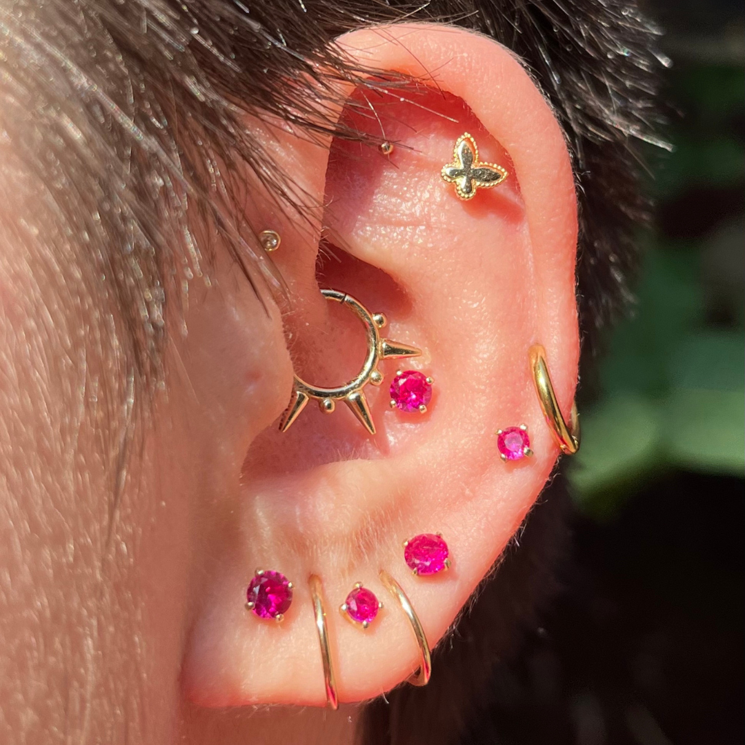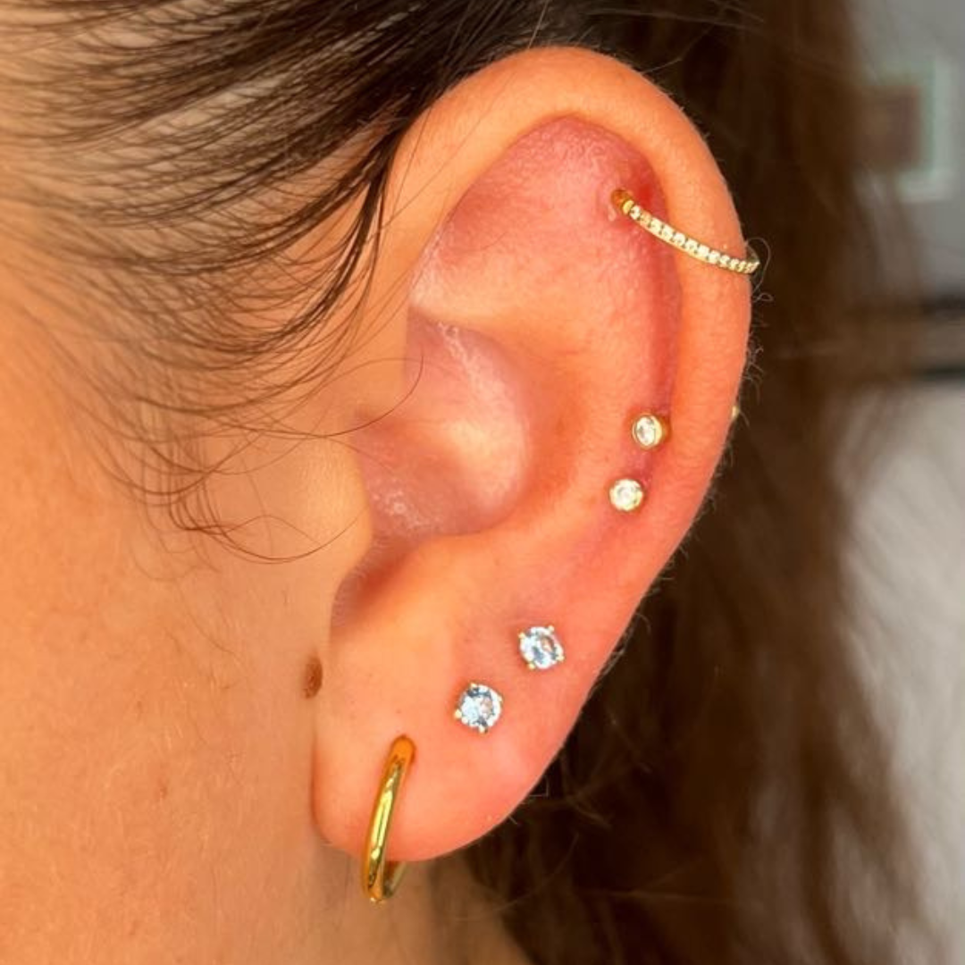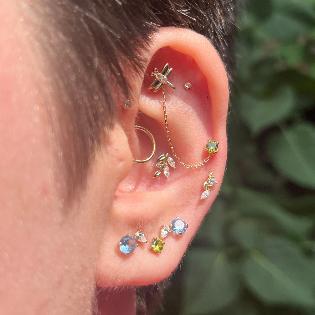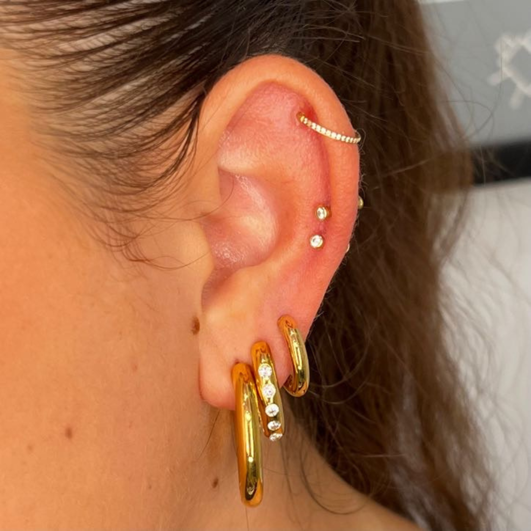 Check out some of our curated ear styling examples below! These photos feature both our team members and amazing customers who let us design their ear setups. Most of the earrings shown are available for purchase right here at our studio!