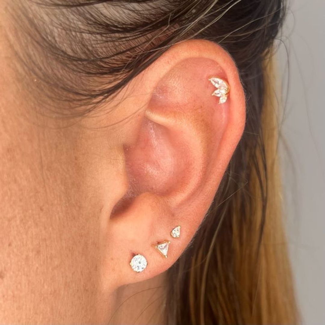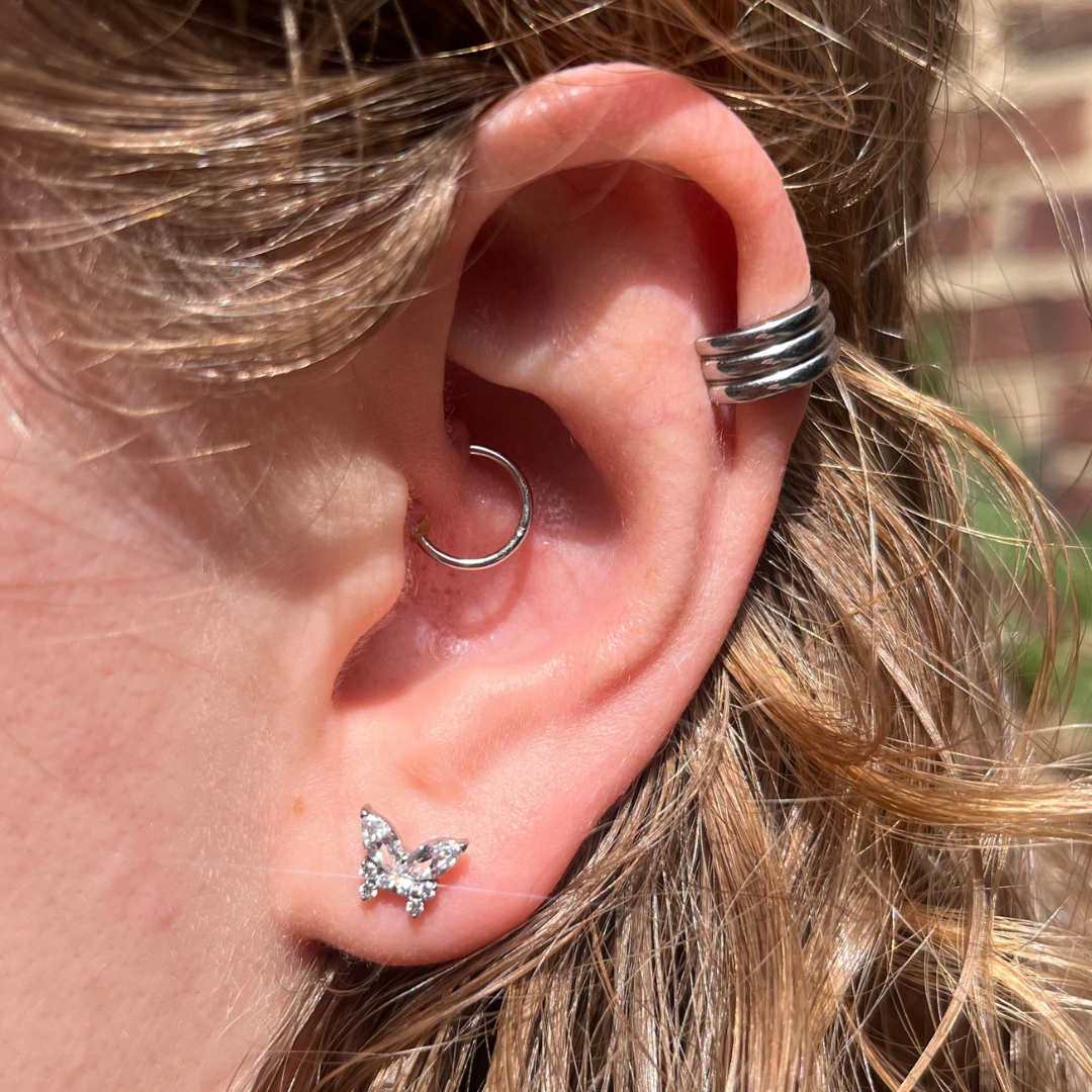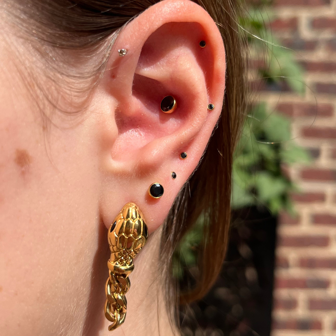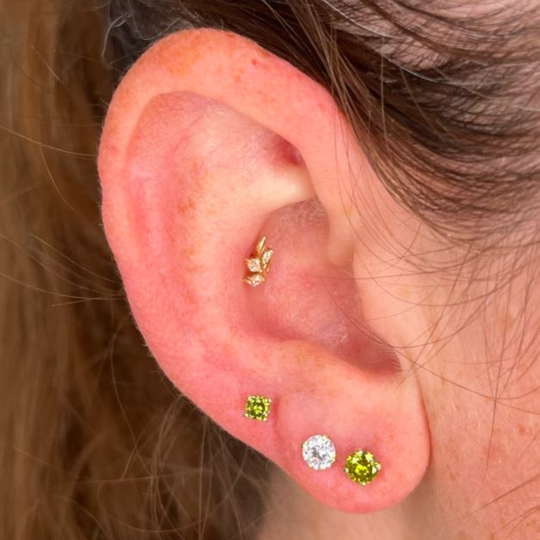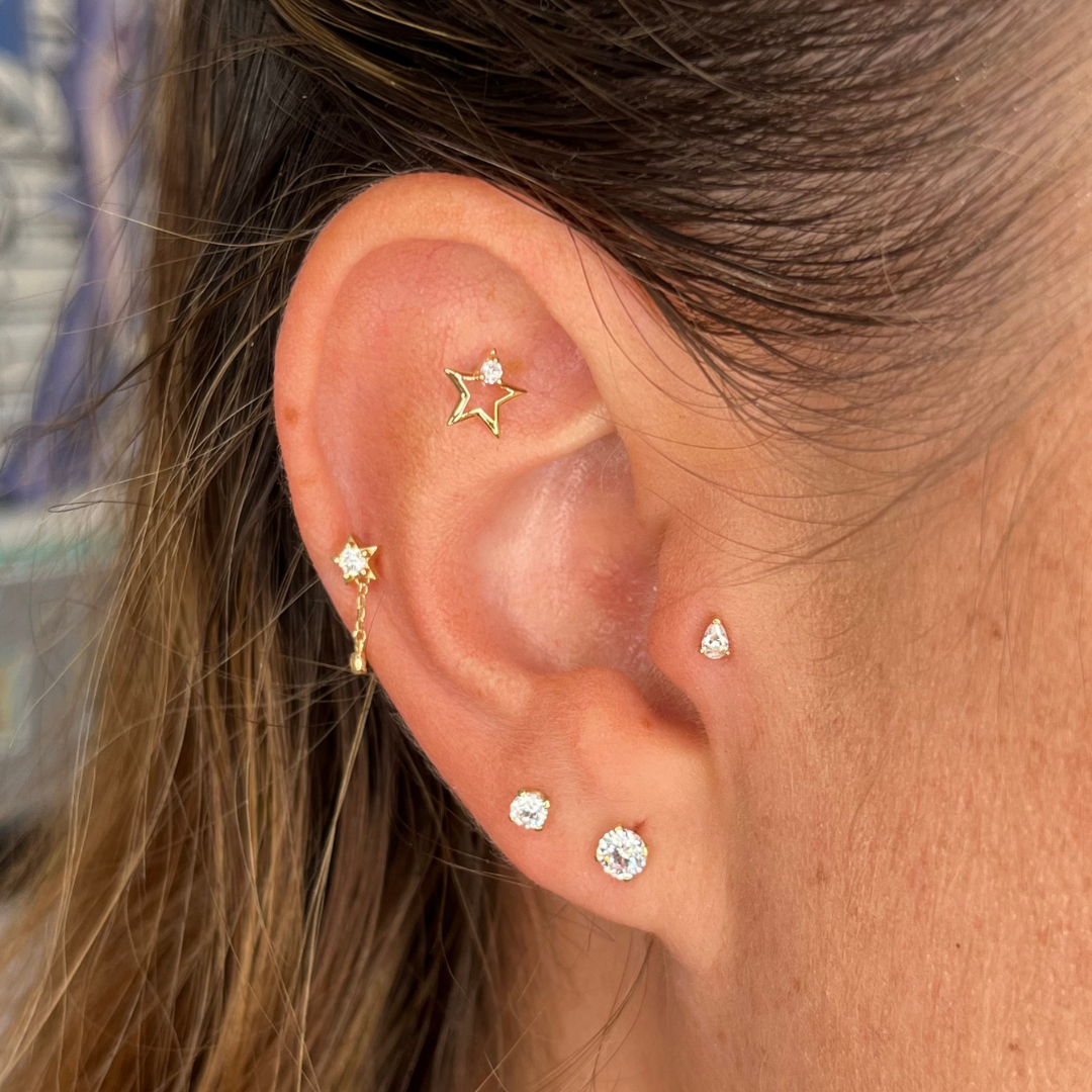 Check out some of our curated ear styling examples below! These photos feature both our team members and amazing customers who let us design their ear setups. Most of the earrings shown are available for purchase right here at our studio!