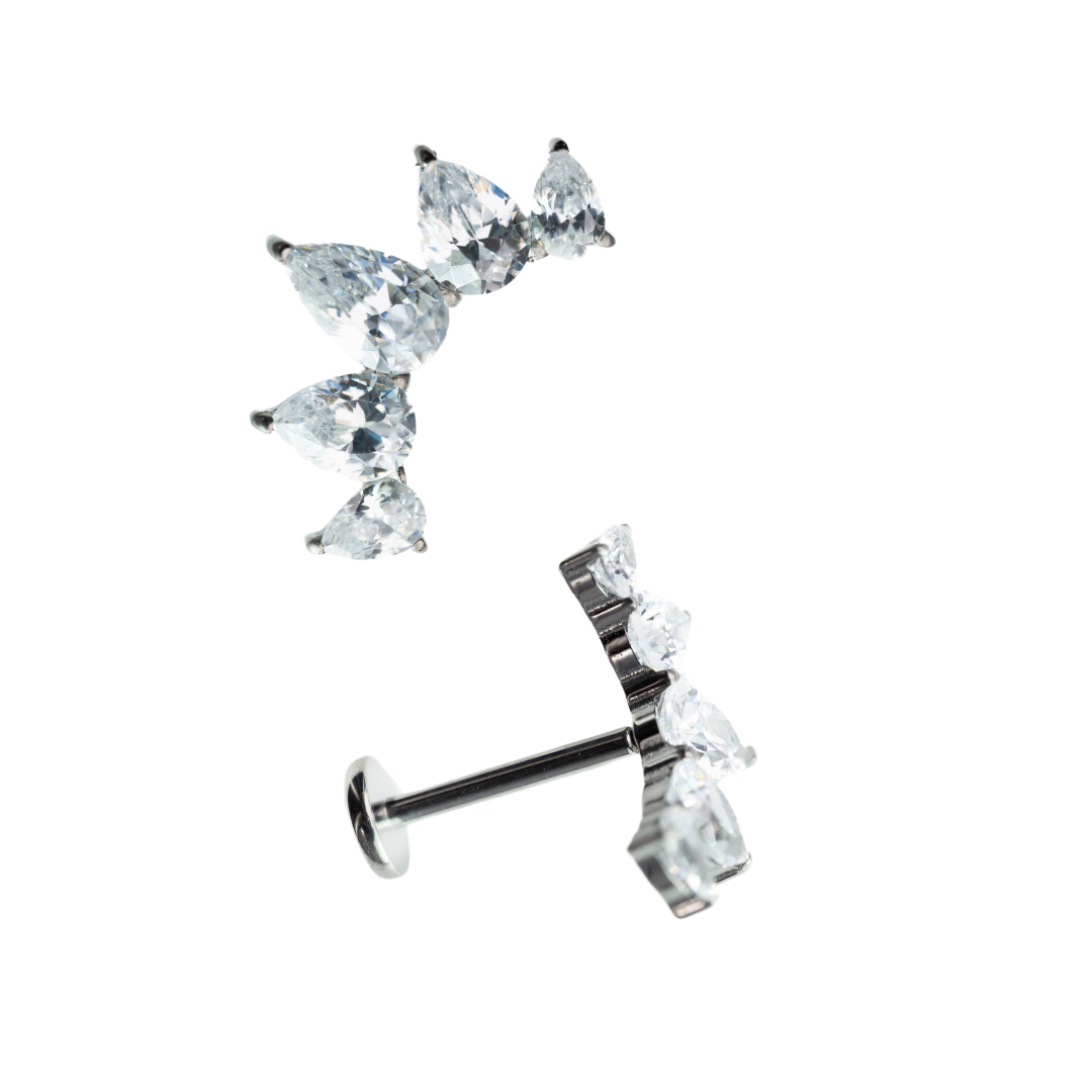 Crown your look with "Queen," featuring a graceful curve of five pear-cut cubic zirconias that resemble a regal tiara. Crafted from durable titanium, this design adds a touch of royalty and sophistication to any piercing.