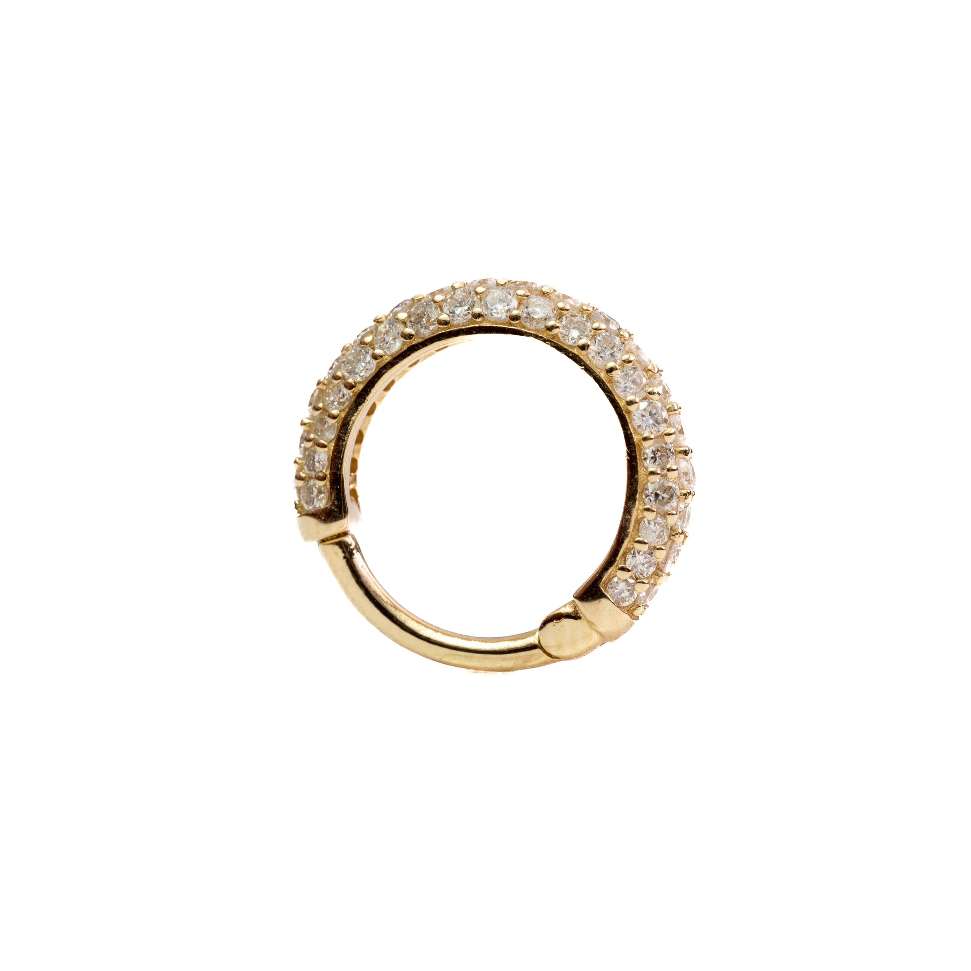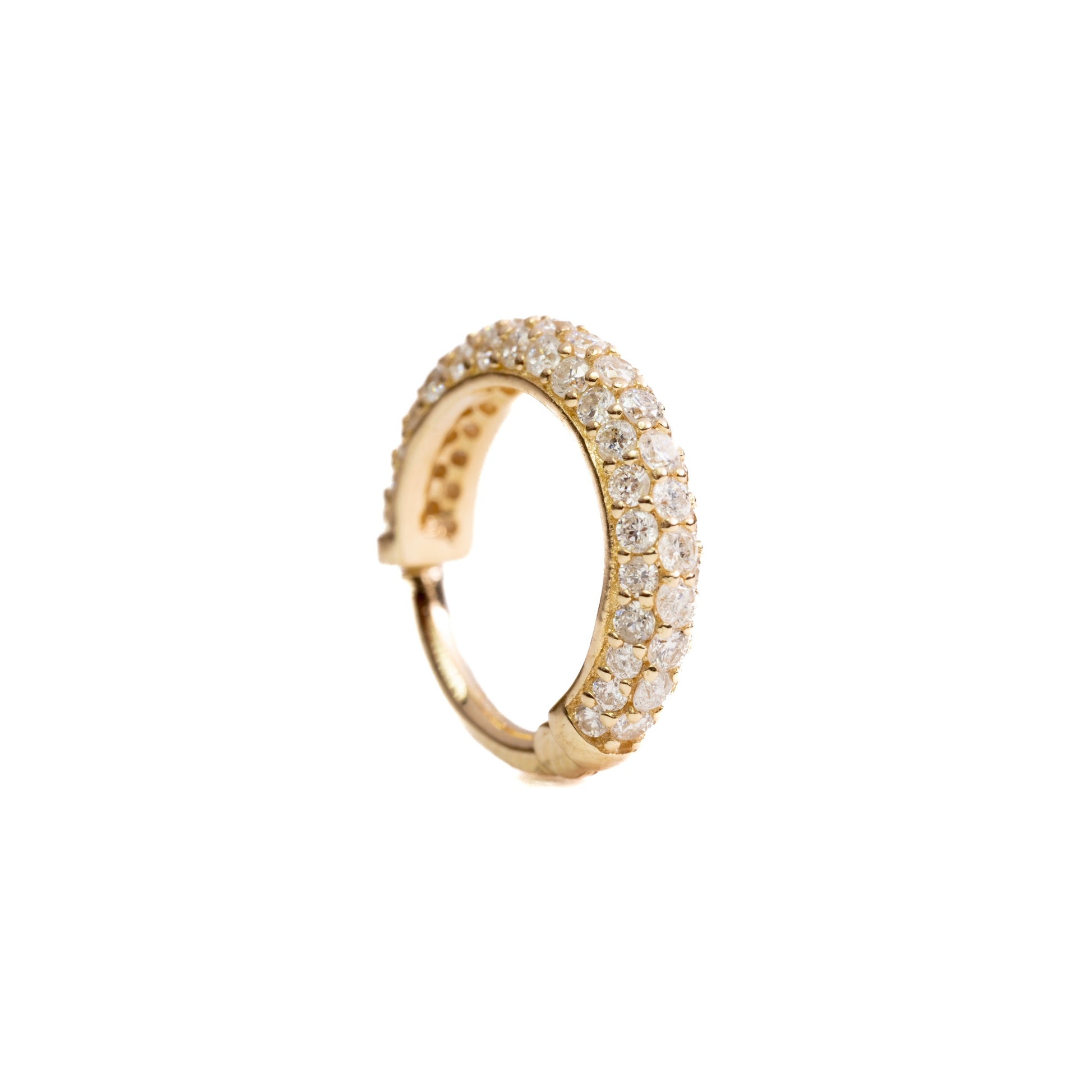 Introducing our Everlasting Single Earring. Adorned with luxurious 14k gold and three rows of sparkling diamonds, this 8MM hoop earring is guaranteed to elevate any look. The perfect piece for those who seek timeless elegance and uncompromising quality.