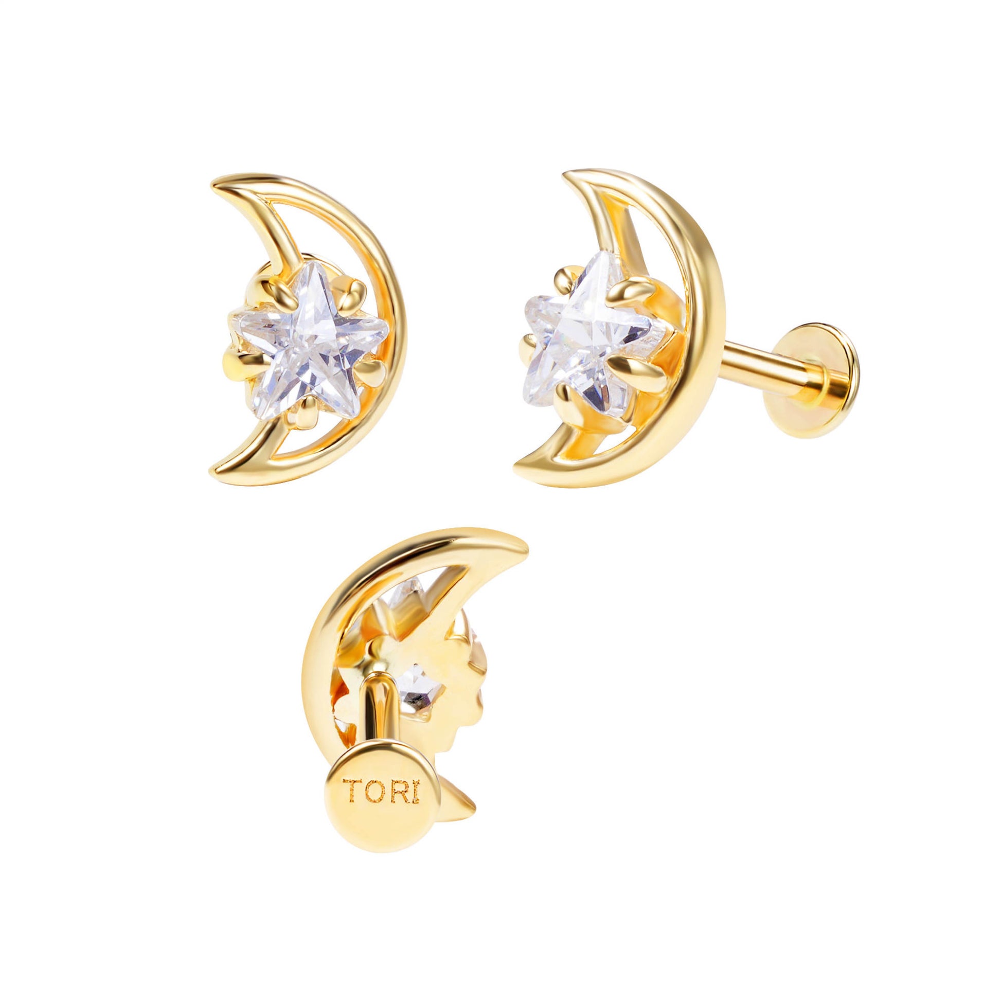 "Dream" 14k Gold Threadless Flatback Crescent Moon with Star Stud