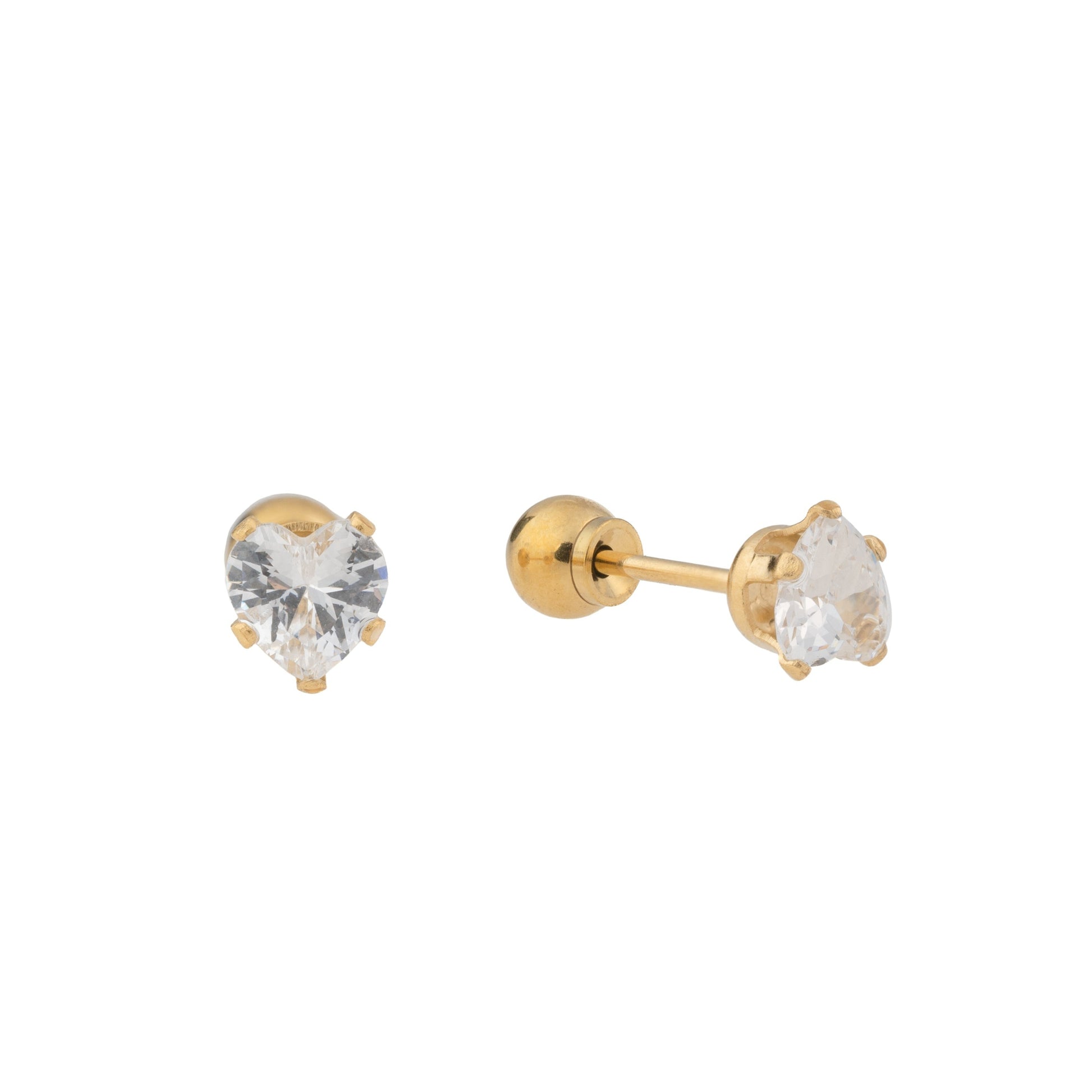 This hypoallergenic, non-tarnish gold-plated stainless steel earring features a heart-shaped design with a prong-set clear CZ at the center. Finished with a secure ball-shaped push back for a comfortable fit. A sweet and sparkling addition to any jewelry collection! ❤️💎