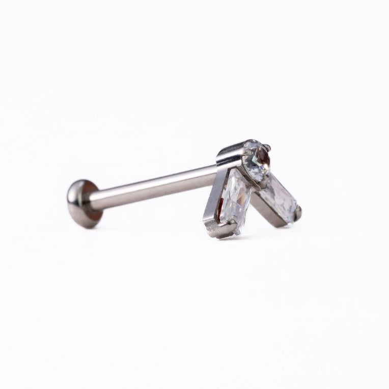 Stand out with "Divergence," featuring a brilliant prong-set cubic zirconia center accented by two angled cubic zirconia baguettes branching out in an elegant L-shape. Crafted from durable titanium, this unique design brings modern sophistication to any piercing.