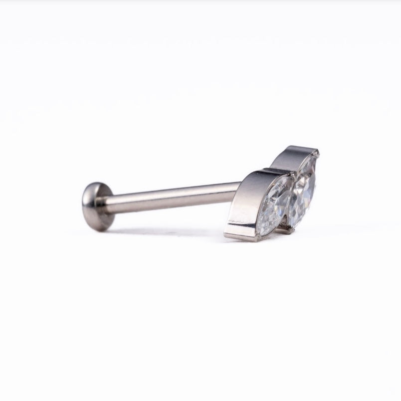 Embrace fresh elegance with "New Leaf," featuring two bezel-set marquise cubic zirconias elegantly connected by their sides. This sleek design, crafted from durable titanium, adds a touch of sophistication and style to any piercing.