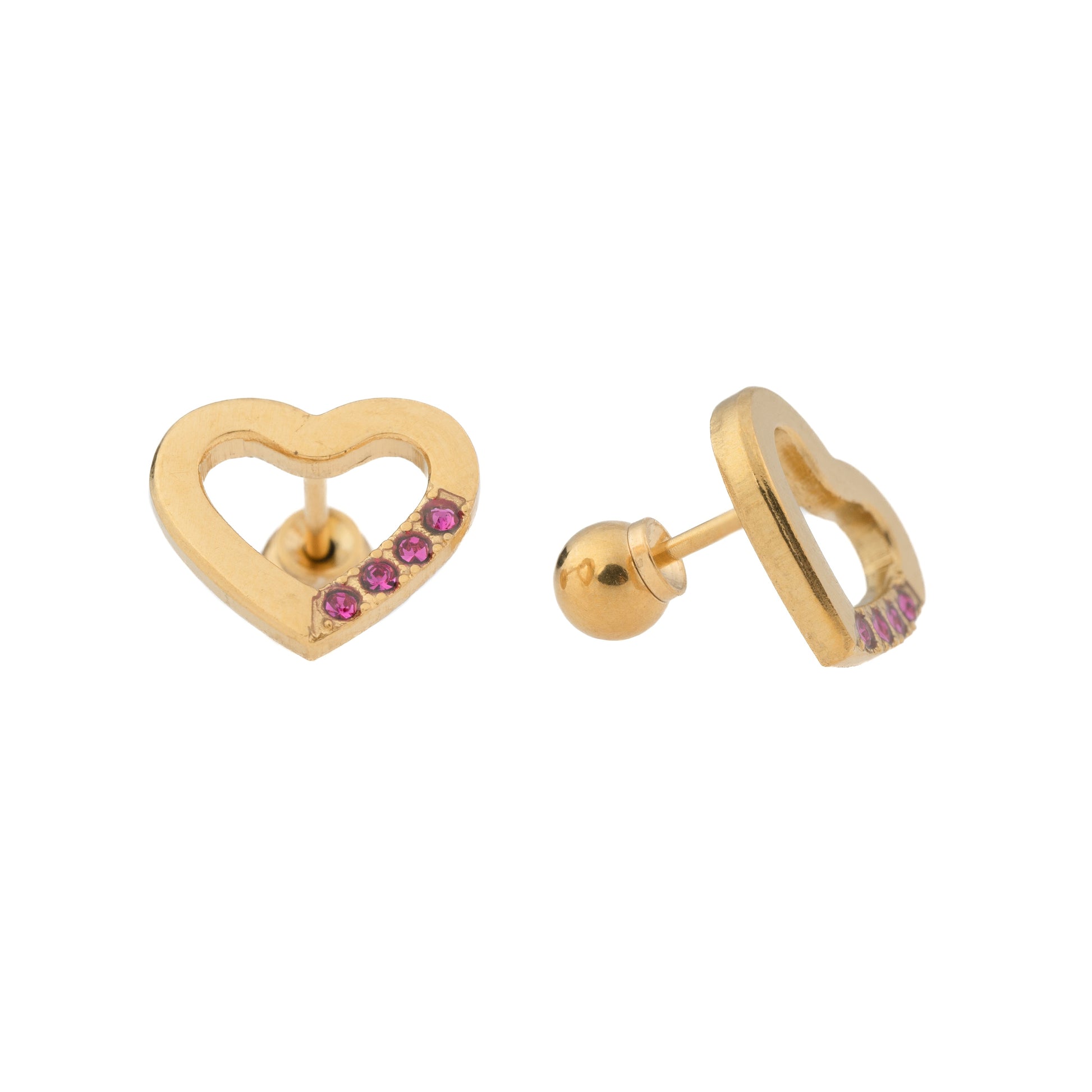 Delicate yet dazzling, the Sweetheart Glow stud earring features a sleek heart outline in hypoallergenic, non-tarnish gold-plated stainless steel. Four embedded pink CZs add a subtle sparkle, while the secure ball-shaped push back ensures comfortable wear. A charming touch of elegance for any look!