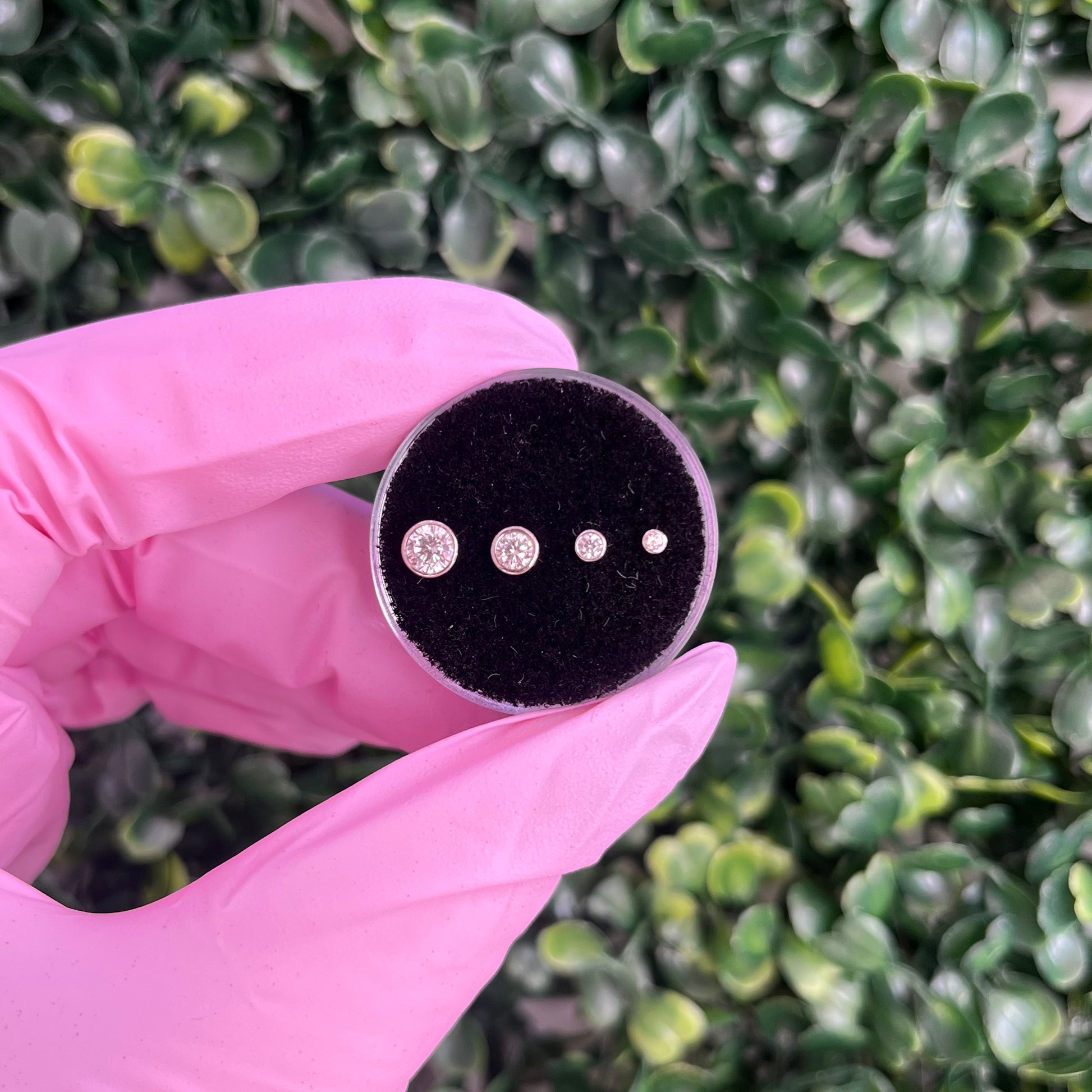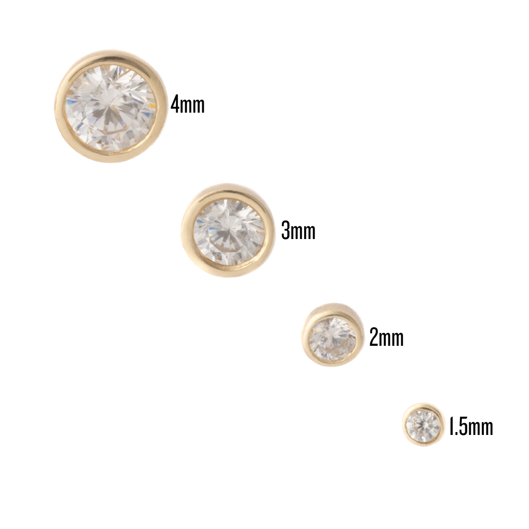 The "Minimalist Bezel" earring features a sleek, simple design with a single cubic zirconia set in a delicate bezel, perfect for those who appreciate understated elegance. Available in both yellow and white gold, this threadless flatback stud is available in sizes 1.5mm, 2mm, 3mm, and 4mm.