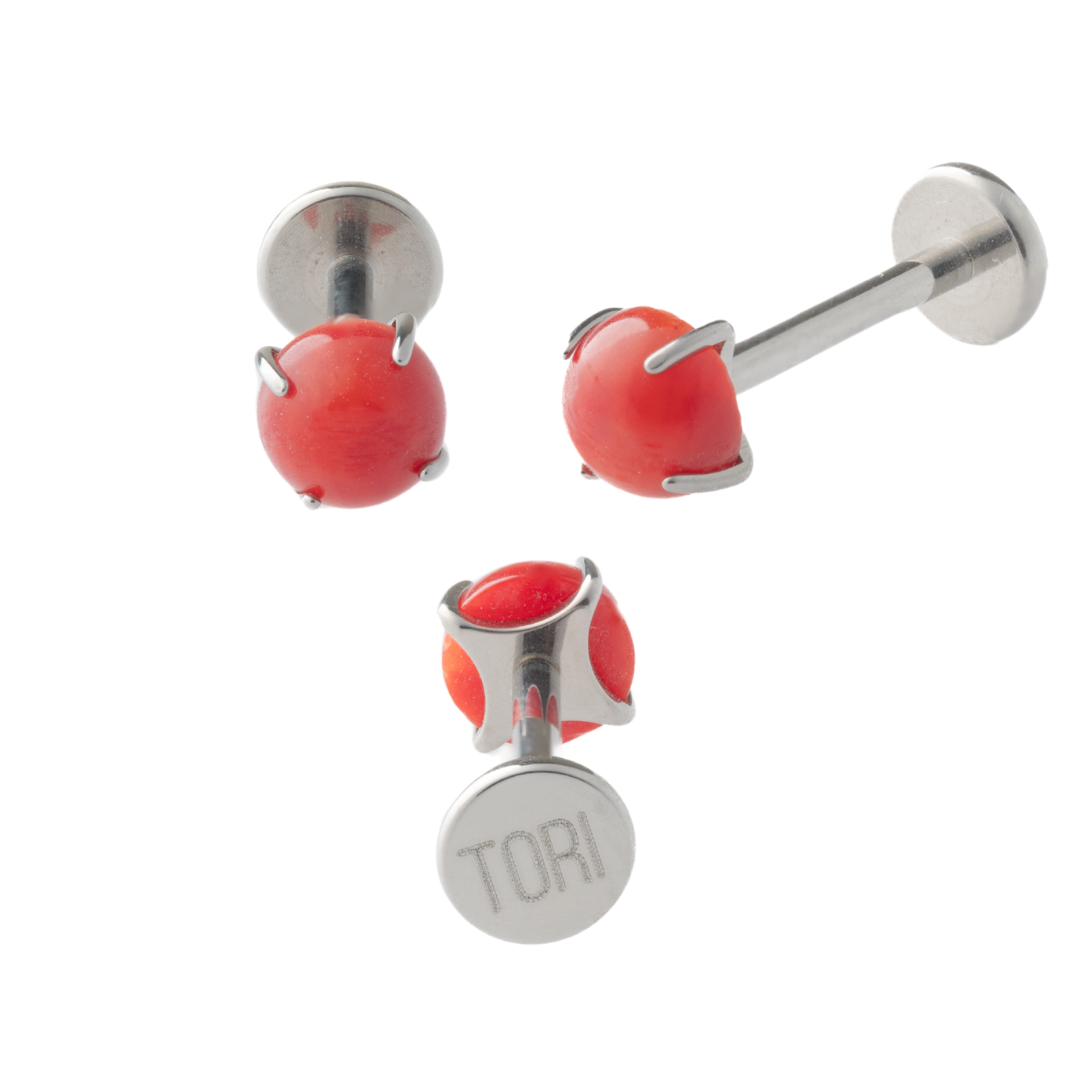 "Red Coral" Titanium 18G Threadless Flatback with 4mm Red Coral Stone