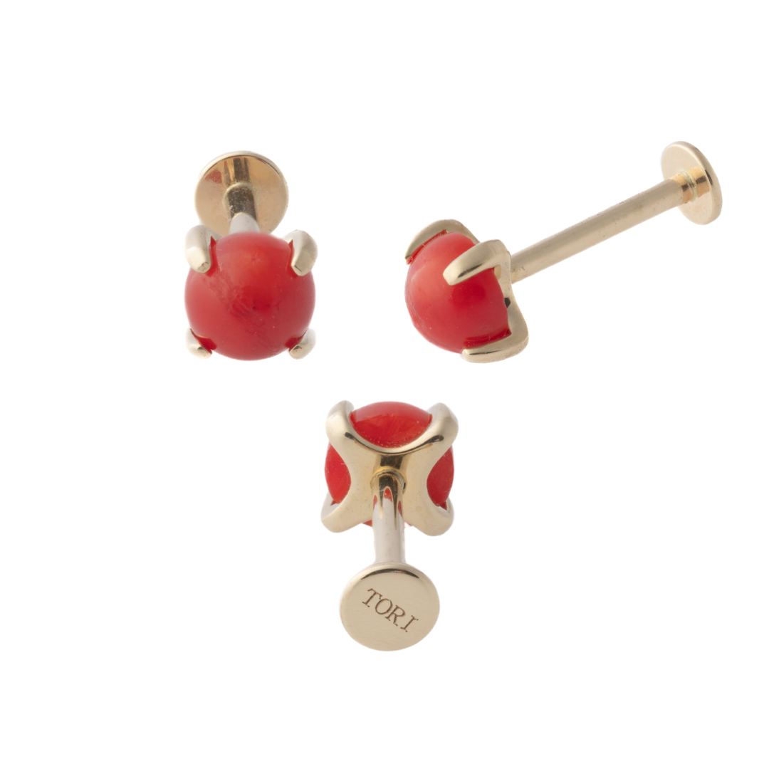 "Red Coral" 14k Gold 18G Threadless Flatback with 4mm Red Coral Stone