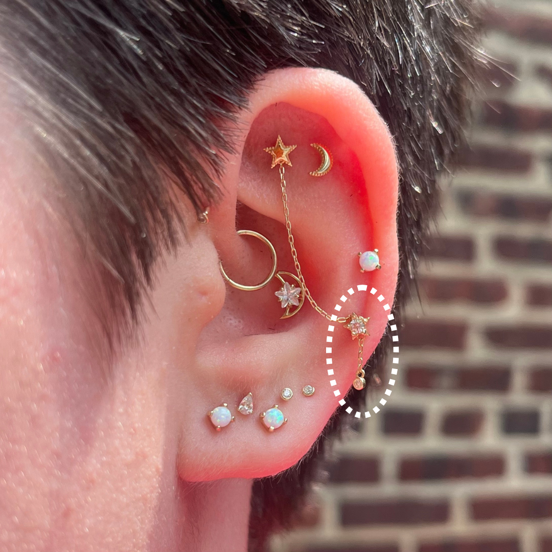 "Starfall" 14k Gold 18G Threadless Flatback with Prong Set Cubic Zirconia Star and Drop Down Chain