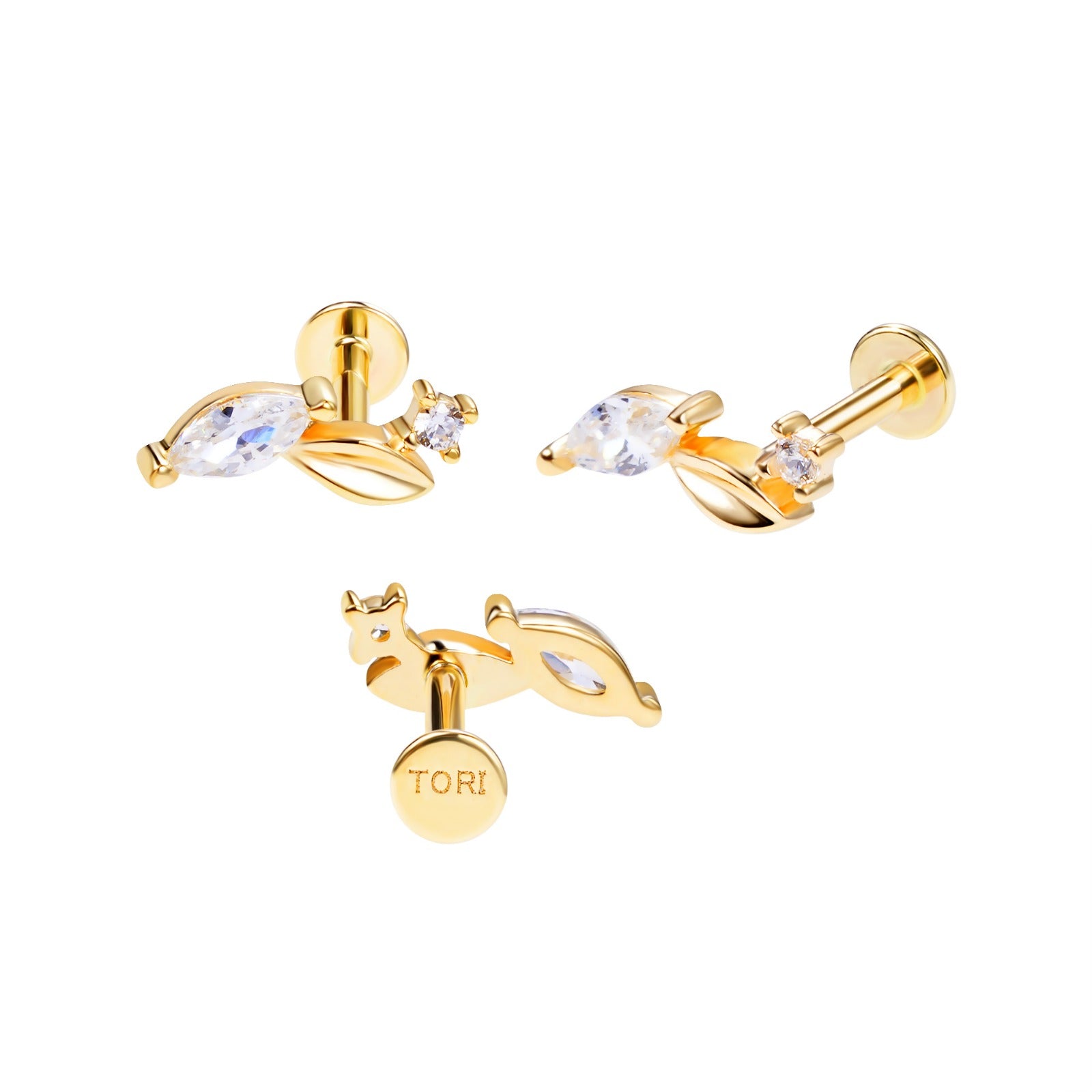 "Spring" 14k Gold 18G Threadless Flatback with Leaf Branch Design and Cubic Zirconia Accents