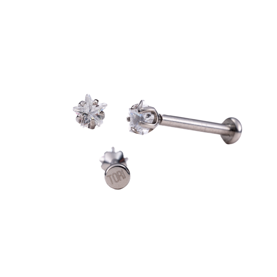 Add a touch of celestial elegance with "Quartz," featuring a prong-set star-cut cubic zirconia that shines with brilliance. Crafted from durable titanium, this design brings a timeless and radiant sparkle to any piercing.