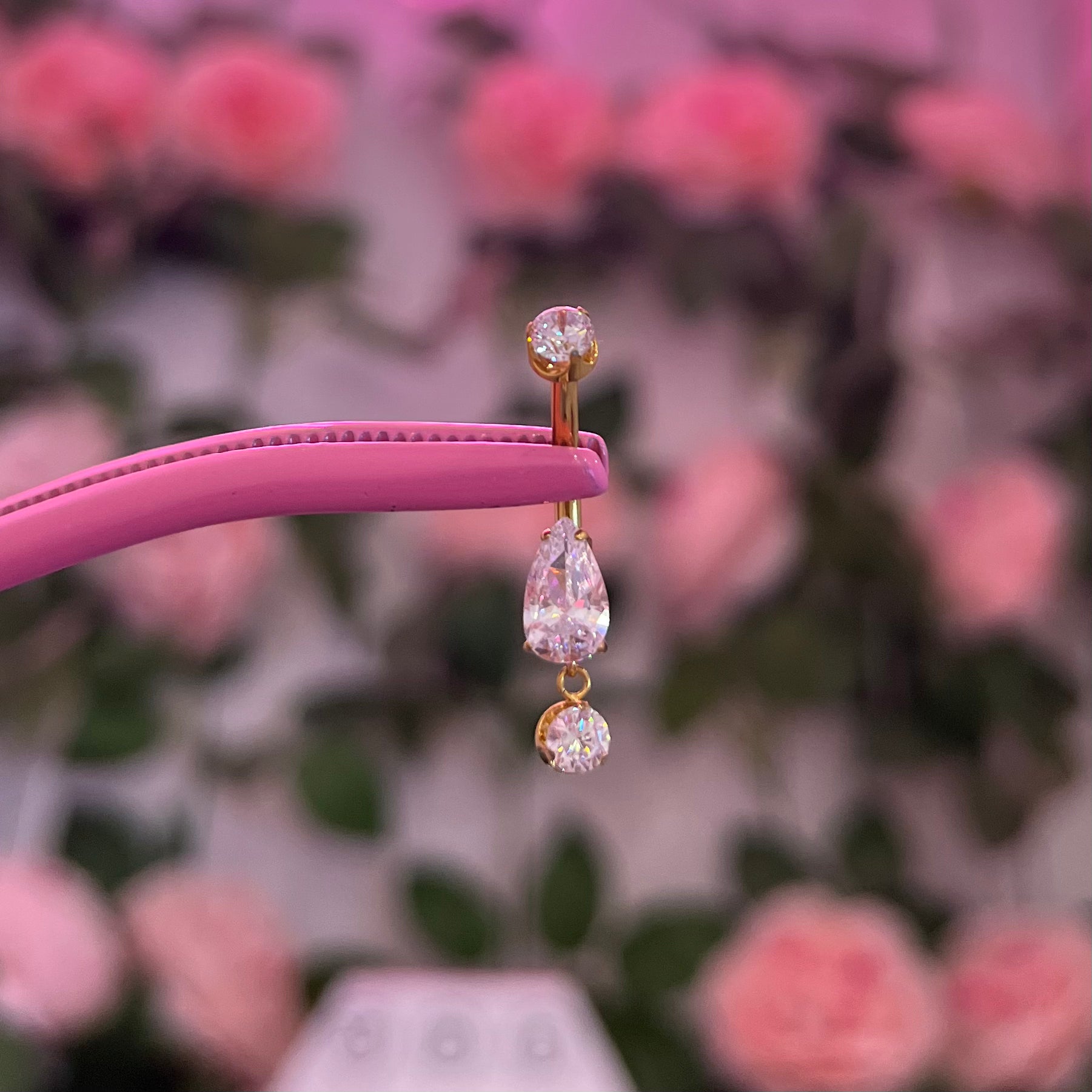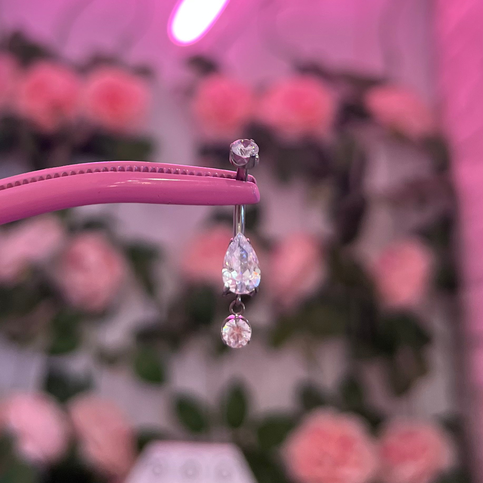 This ultra-cute titanium navel ring is the perfect mix of sparkle and playful charm! The top features a 4mm prong-set clear CZ that catches the light just right, paired with a dazzling 8mm pear-cut CZ on the bottom for a glam, eye-catching drop. But the real showstopper? A dainty 4mm clear CZ charm that swings just below, adding the sweetest, most playful vibe to your belly piercing.