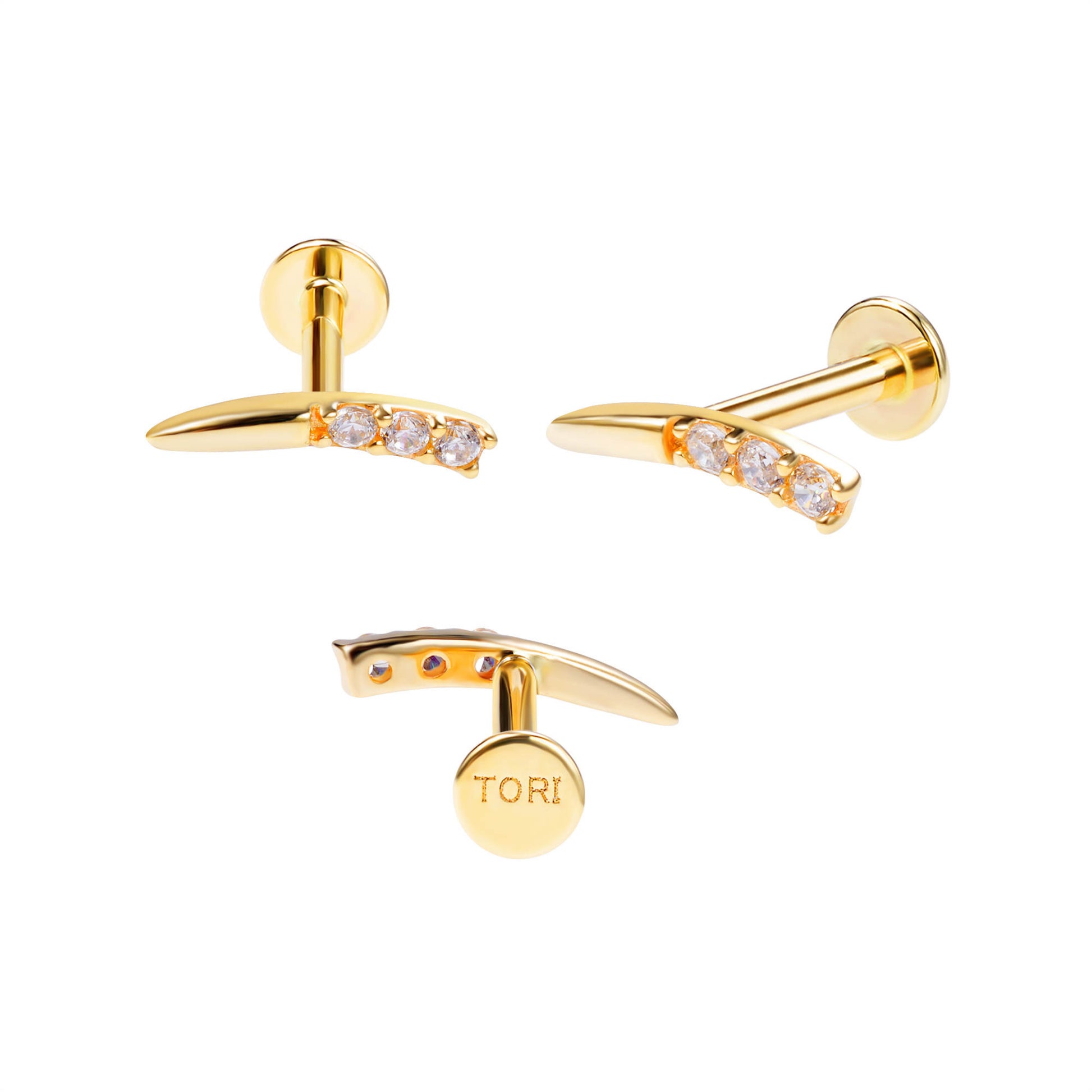 Embrace your bold side with "Wild," a striking 14k gold horn-shaped curved bar stud adorned with three sparkling cubic zirconias. Available in left or right-facing designs, this unique piece adds an edgy yet elegant flair to your piercing.